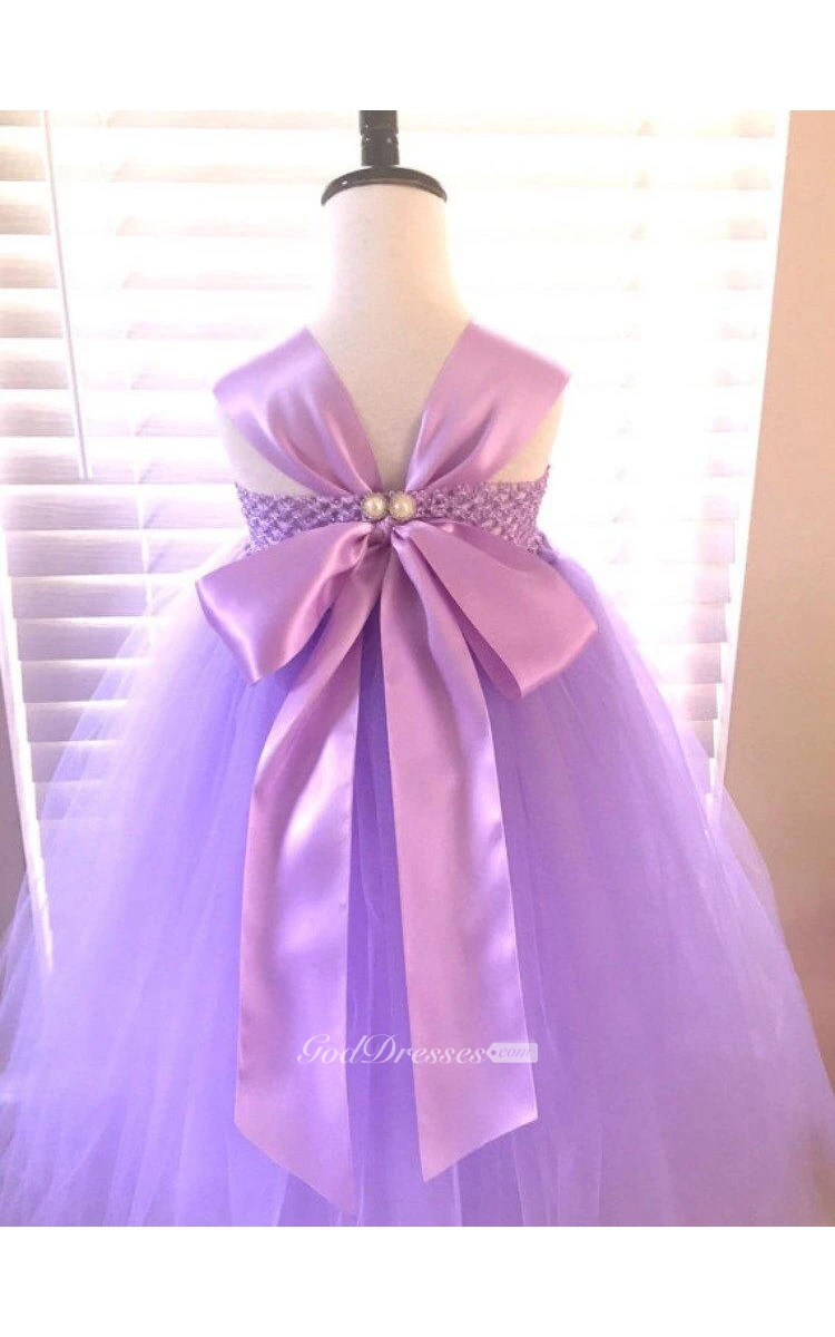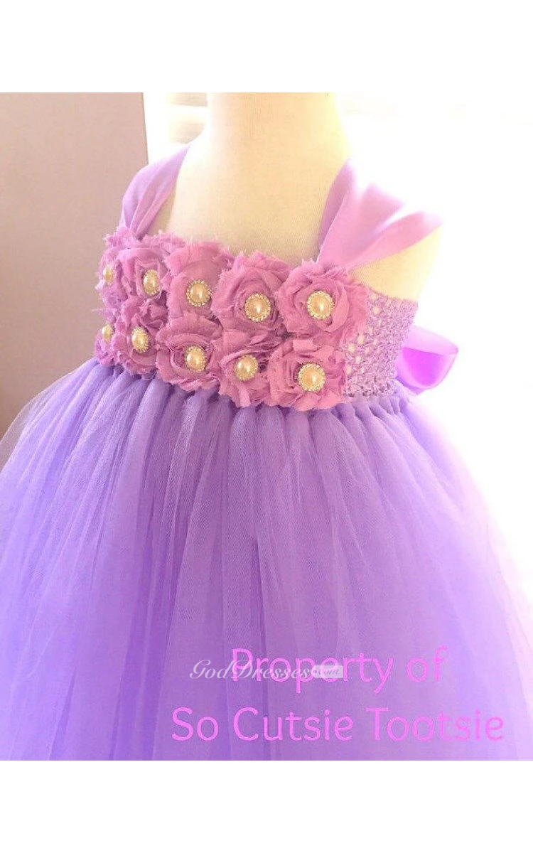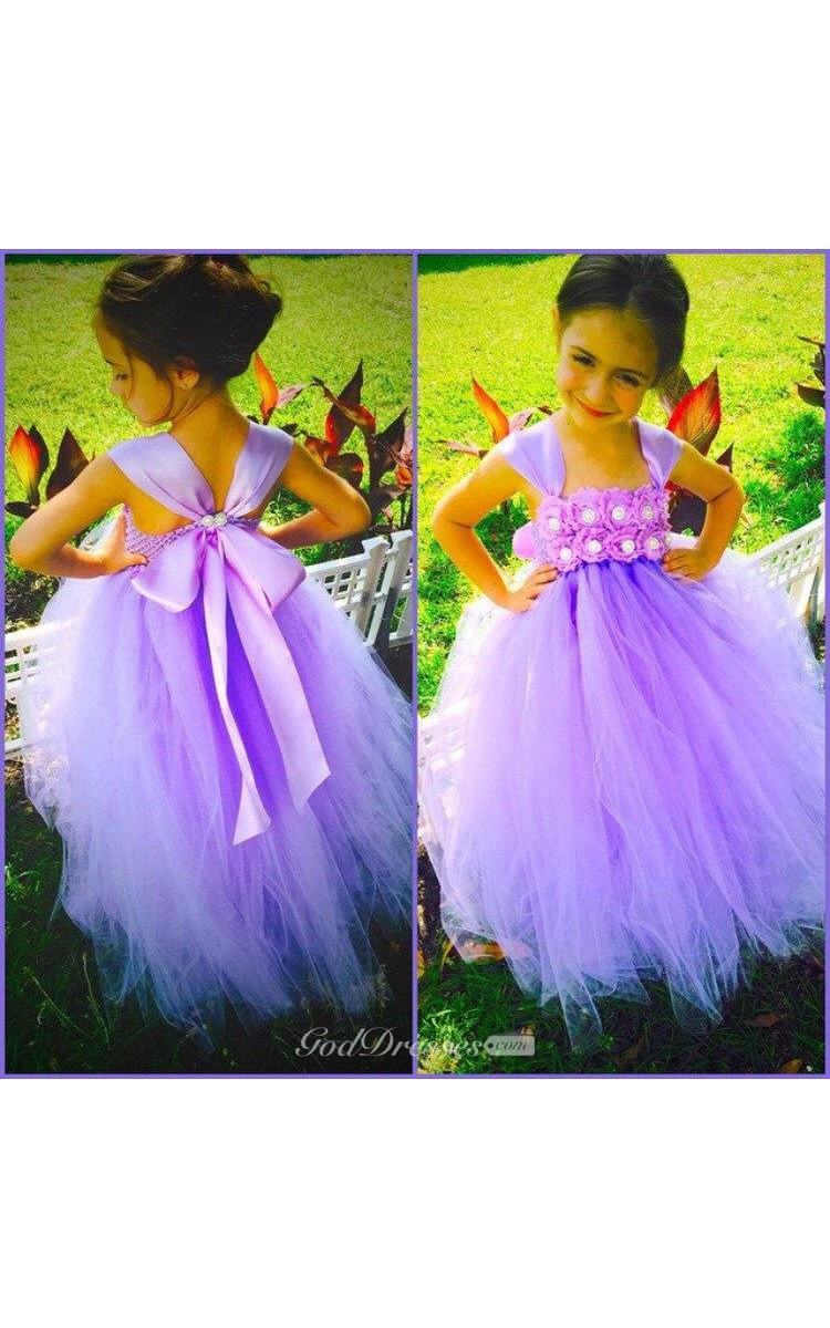 Cap Sleeve Flower Bodice Empire Tiered Tulle Ball Gown With Jewel
