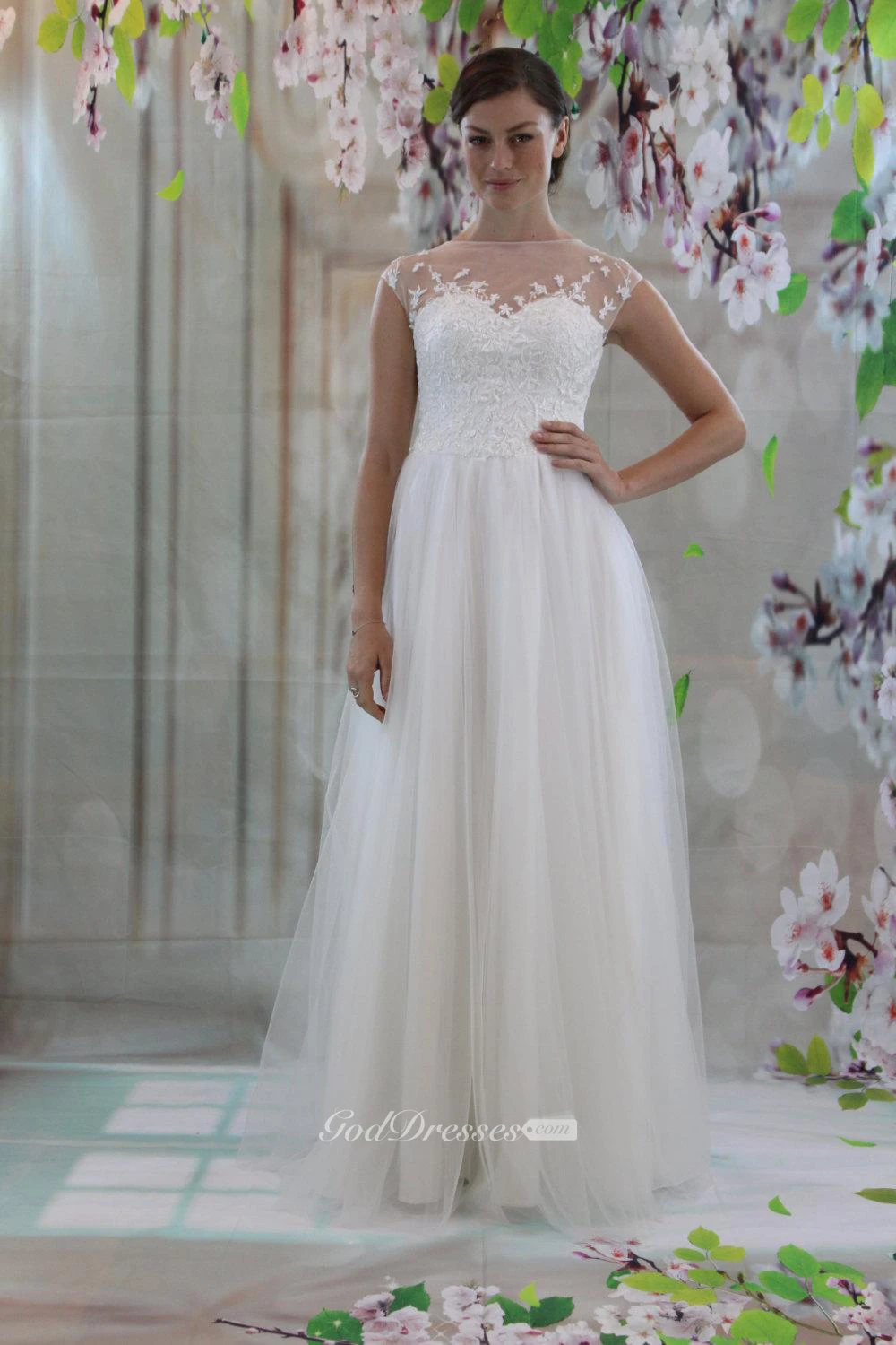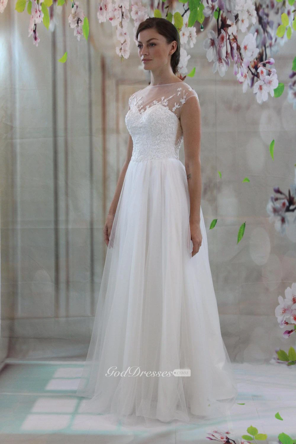 Cap Sleeve High Neck A-Line Lace and Tulle Dress With Illusion Back