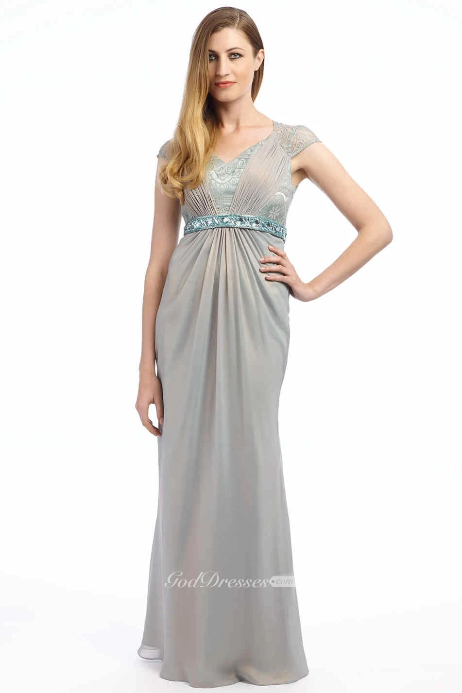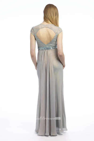 Cap-Sleeve Jeweled Floor-Length V-Neck Chiffon Prom Dress With Lace And Ruching