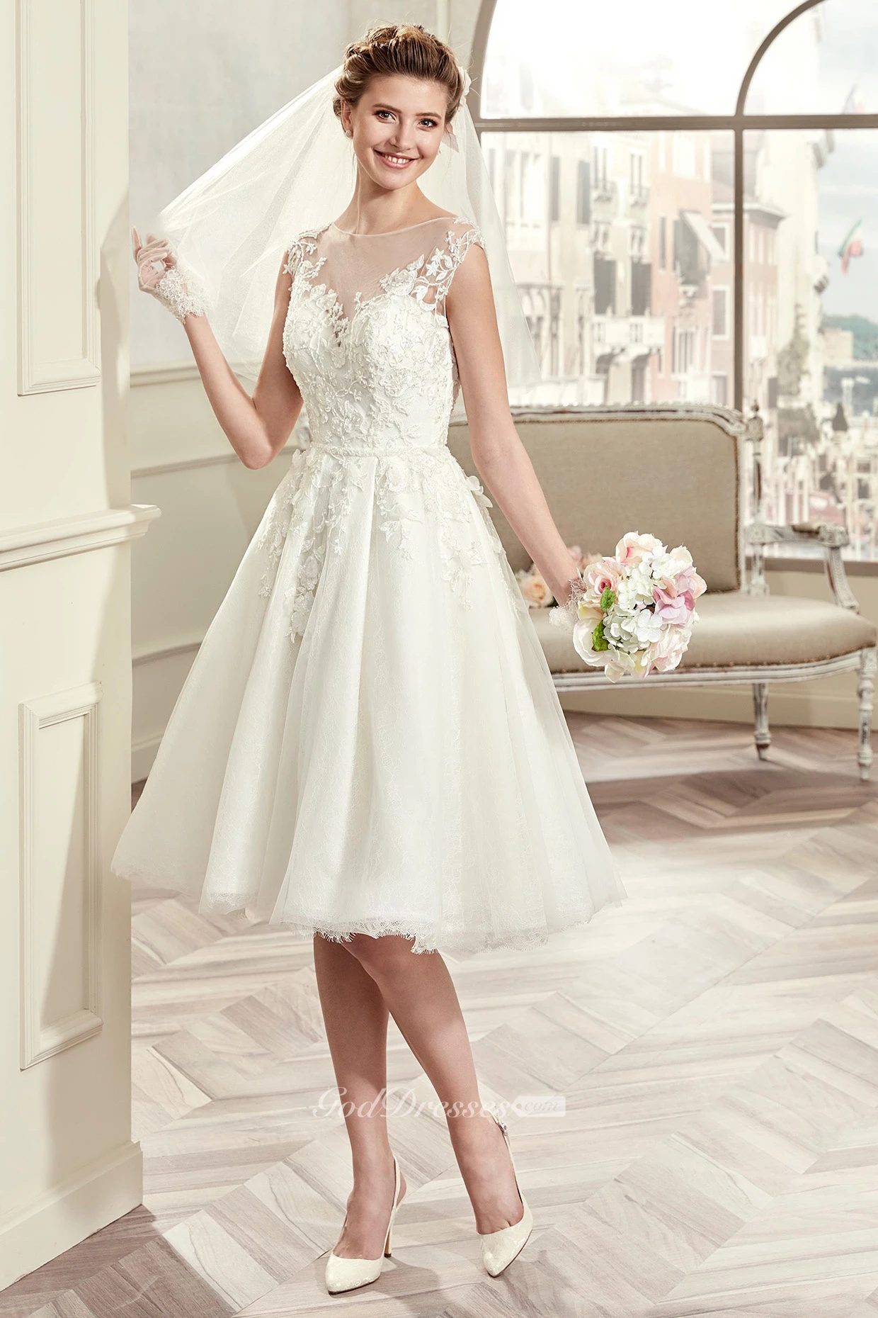 Cap-sleeve Knee-length Wedding Gown with Illusive Design and Lace Bodice