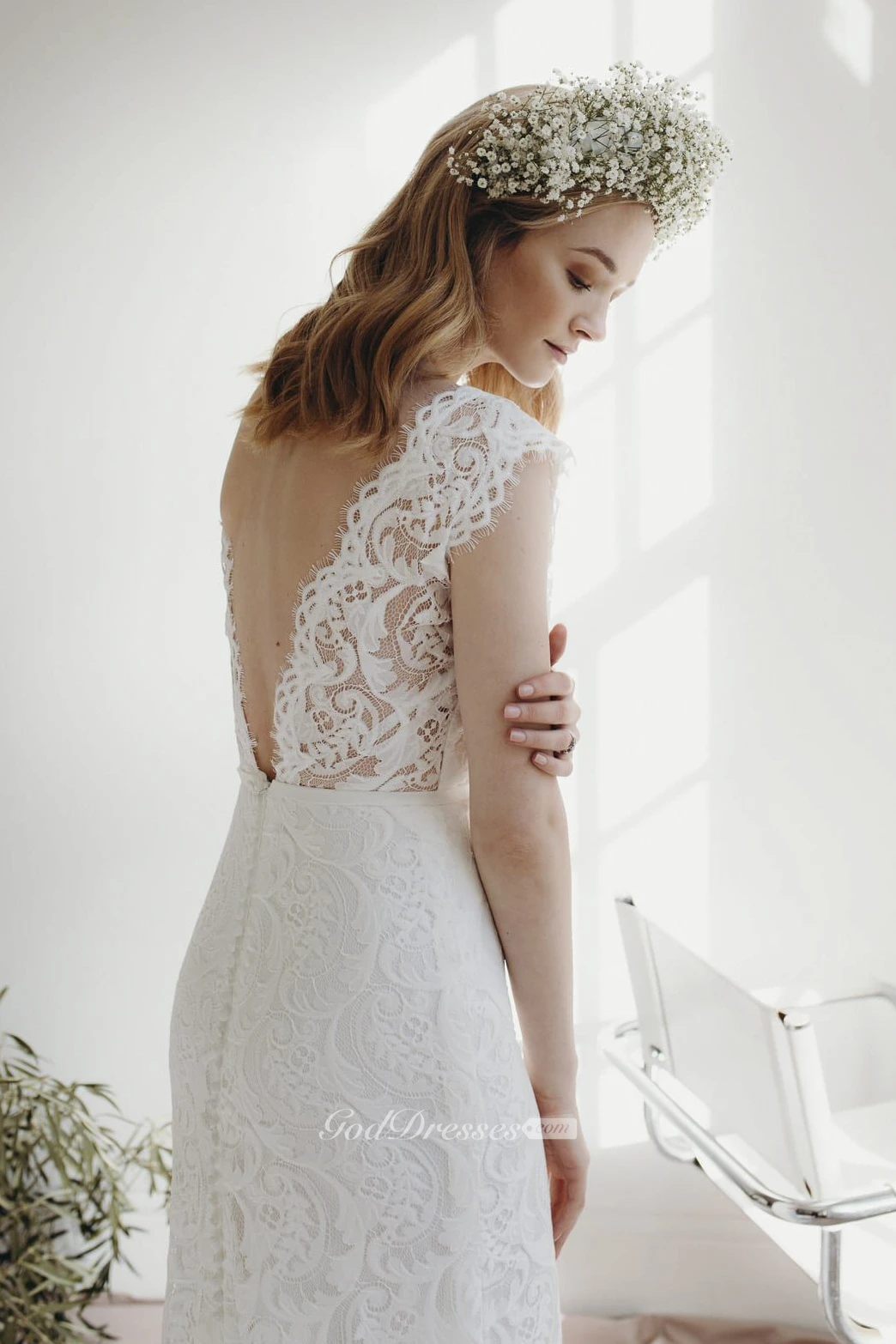 Cap Sleeve Lace Sheath Deep V-neck Wedding Dress With Court Train