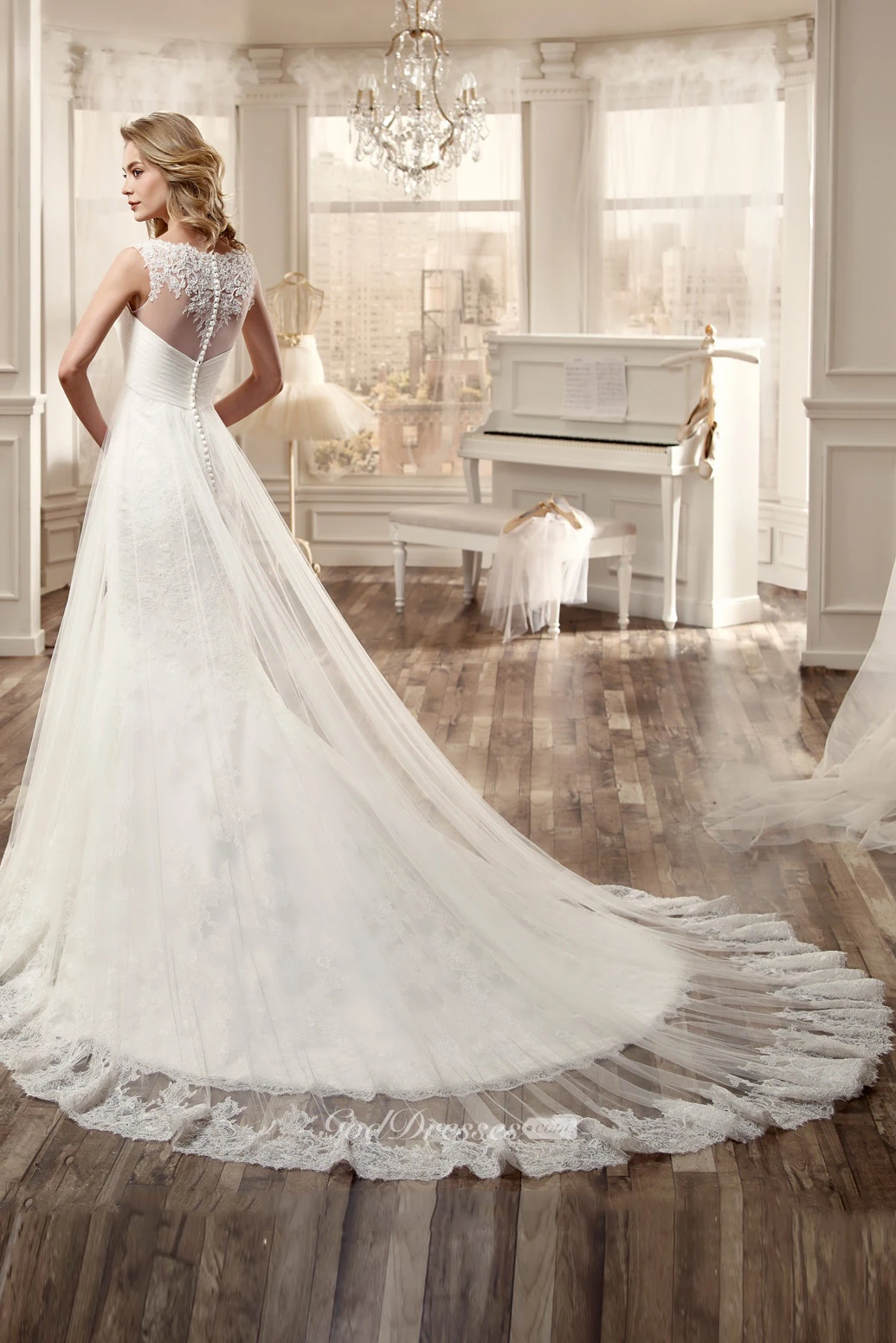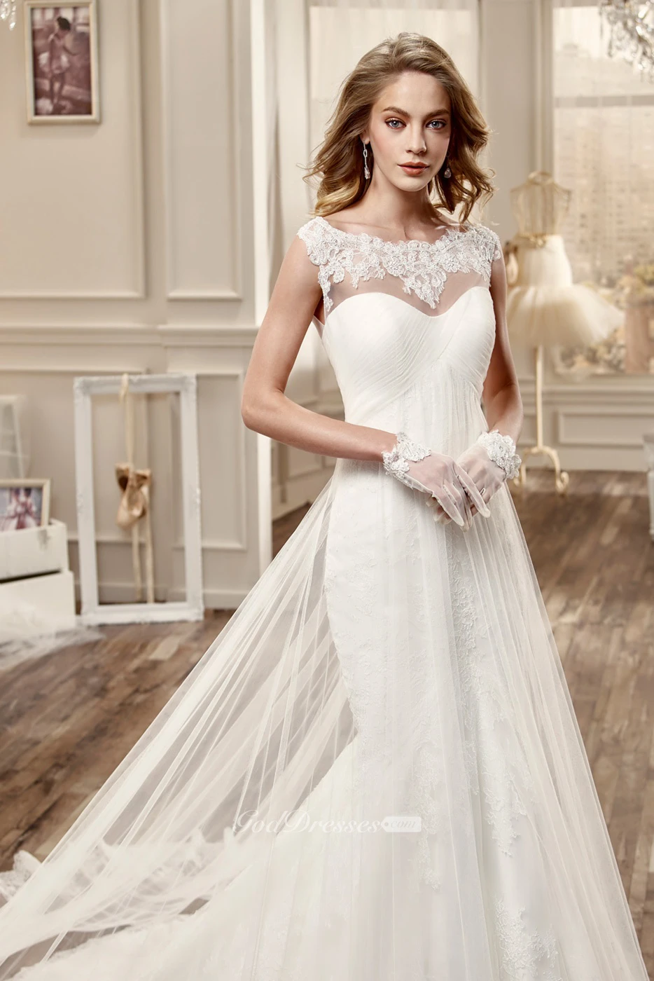 Cap-Sleeve Long Wedding Dress With Pleated Bodice And Invert-V Waist