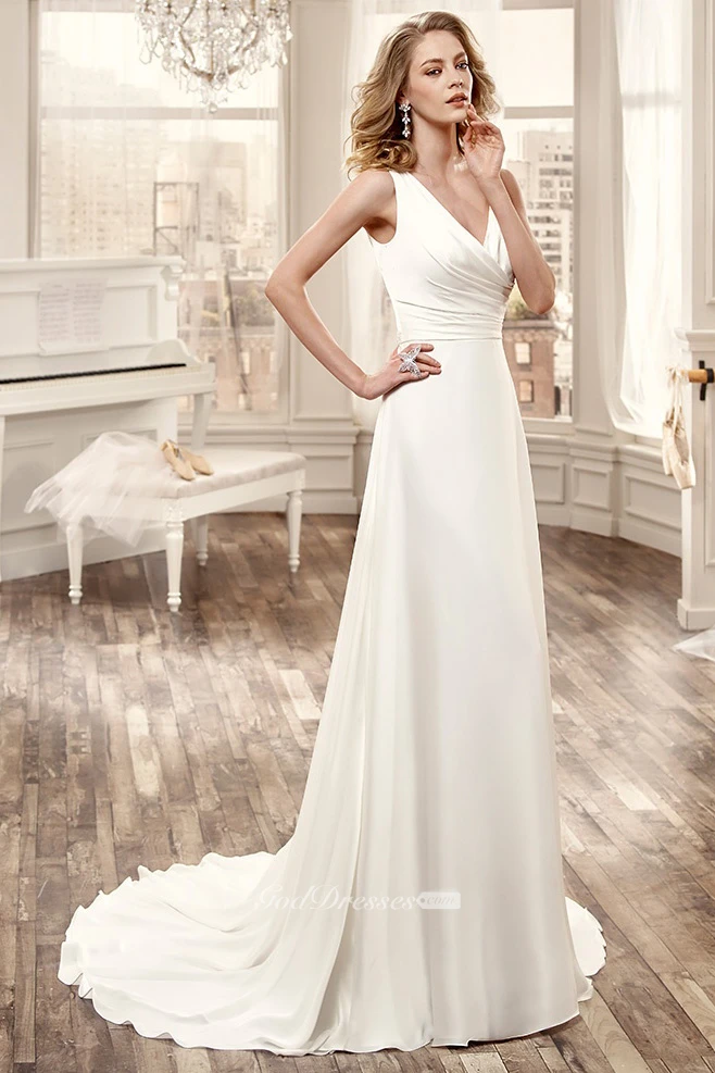Cap-Sleeve Low-V Neckline Chiffon Wedding Dress With Brush Train