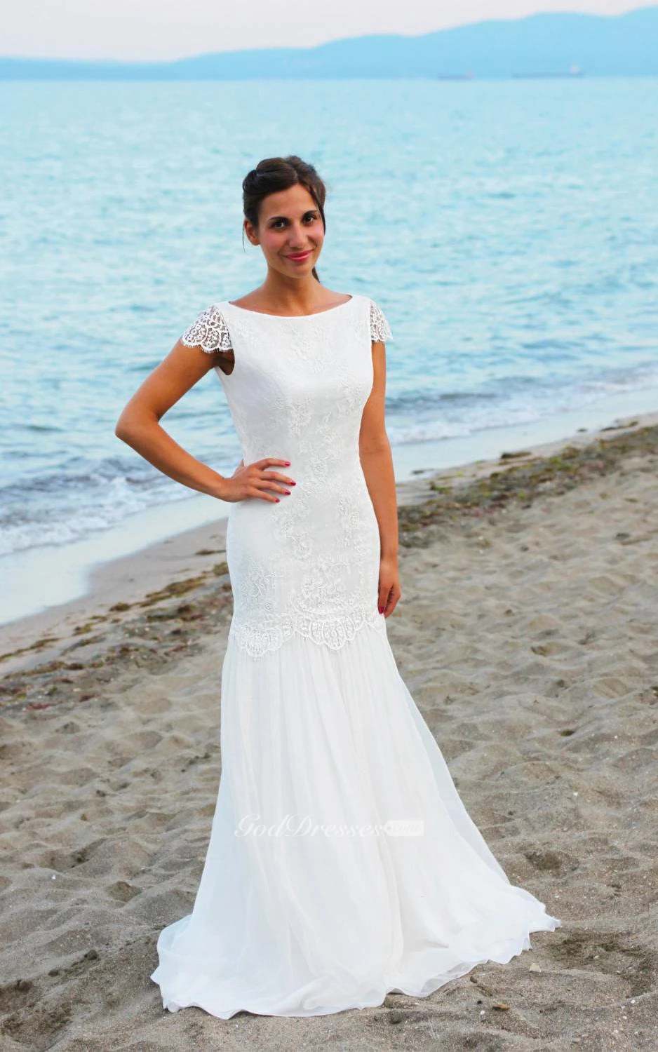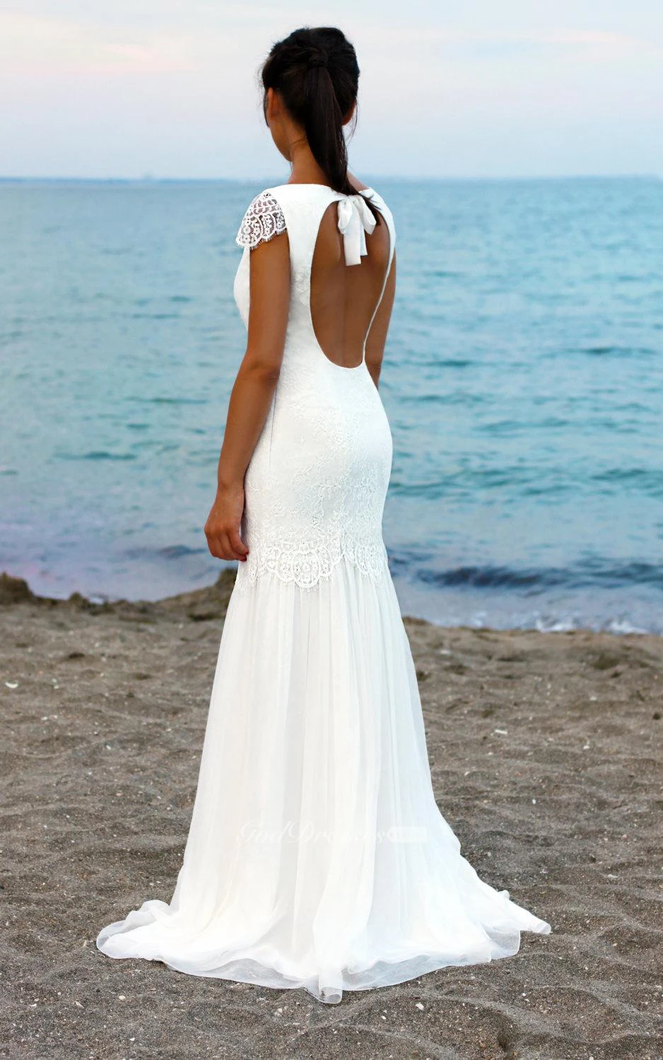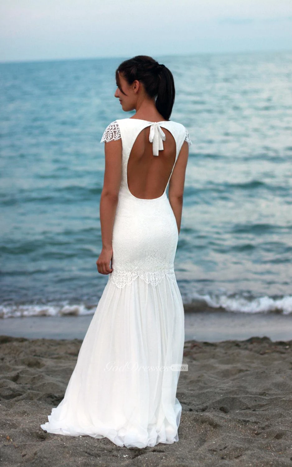 Cap Sleeve Mermaid Lace Bateau Neck Dress With Keyhole Back