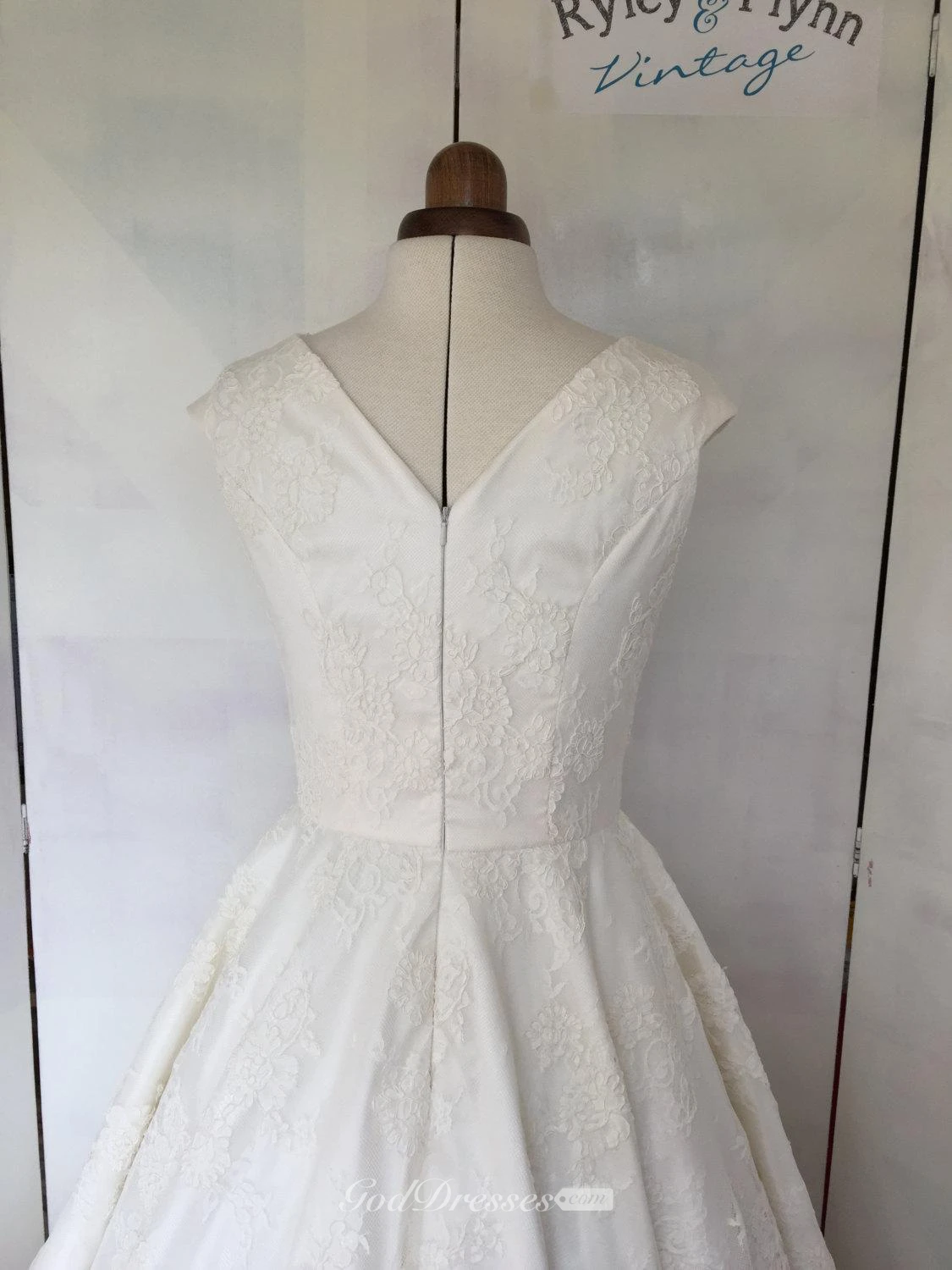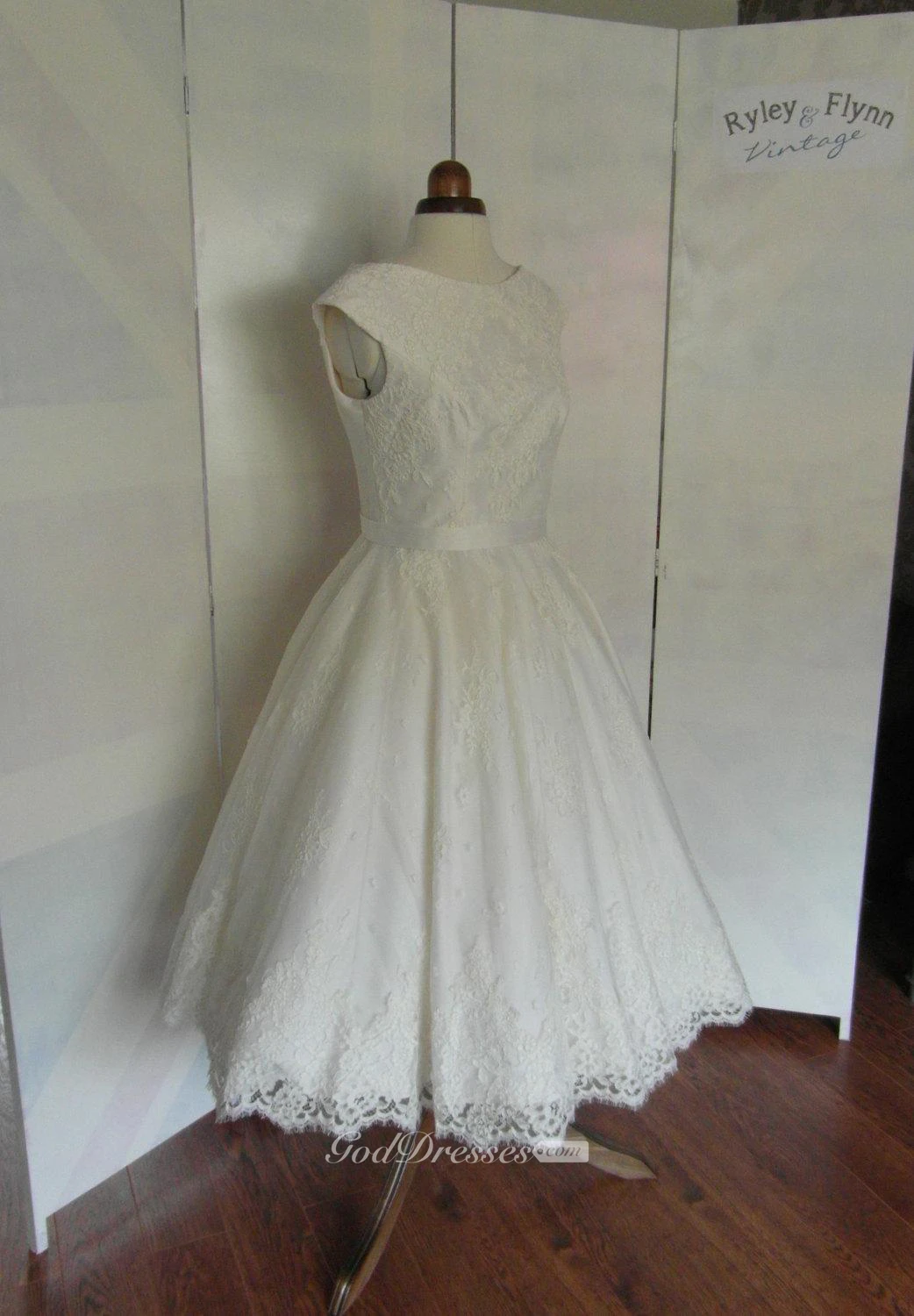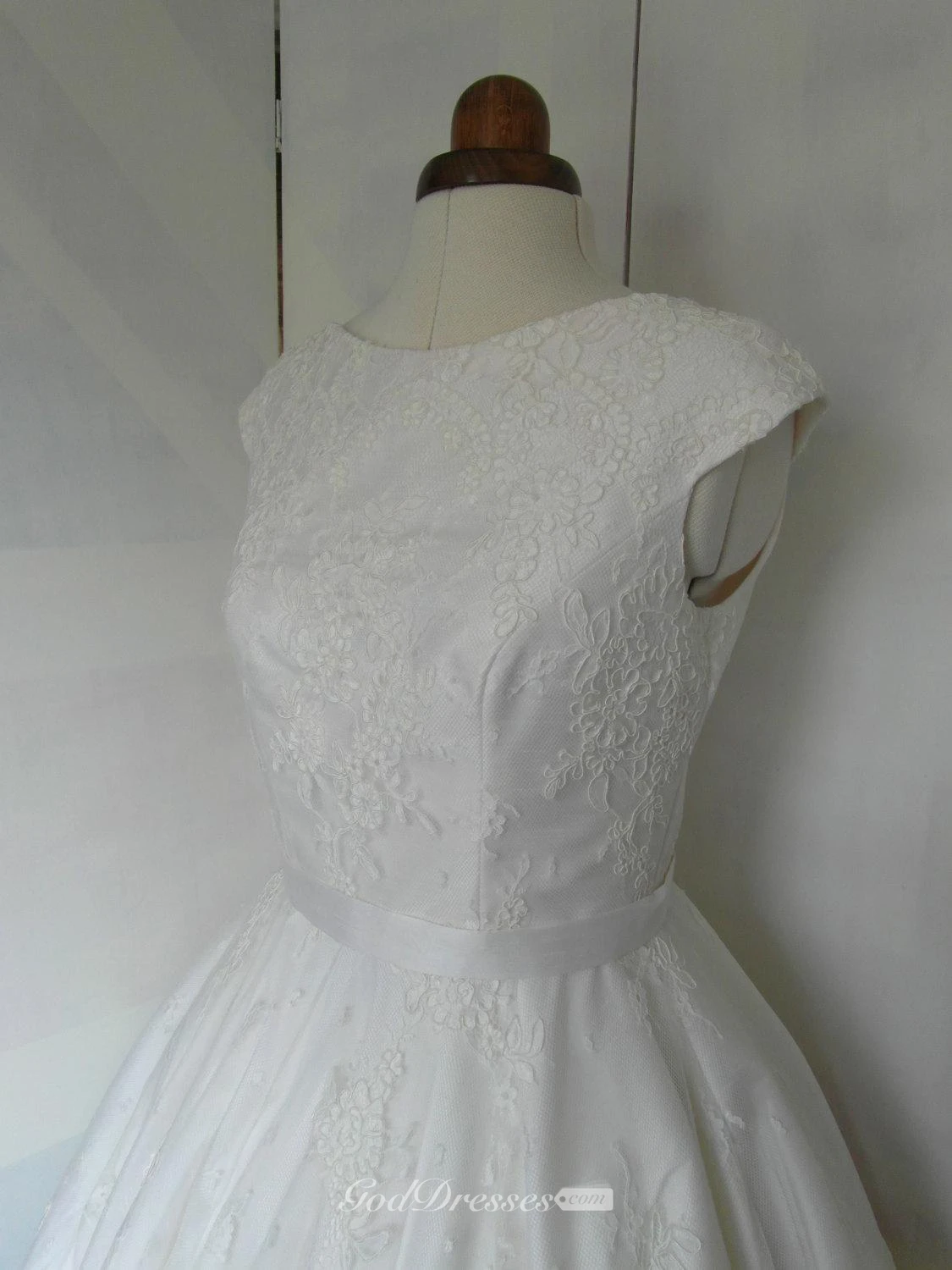 Cap Sleeve Tea Length A-Line Lace Dress With V-Back and Satin Sash