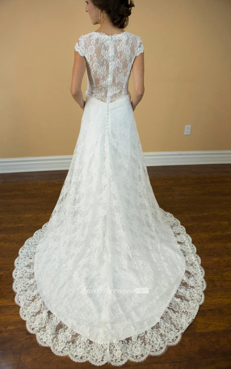 Cap Sleeve V-Neck Lace Dress With Illusion Back and Scalloped-Edge Hemline