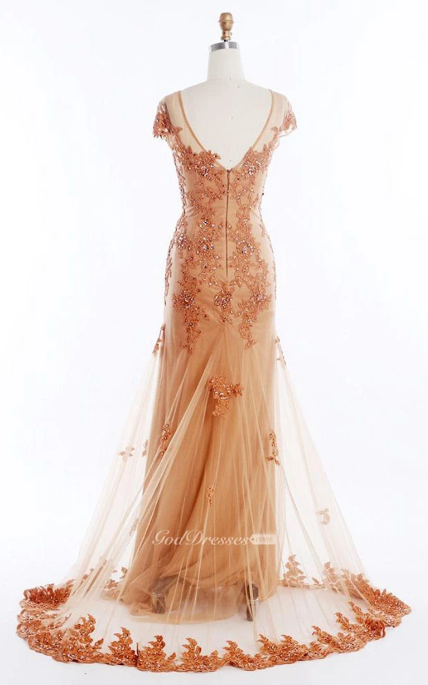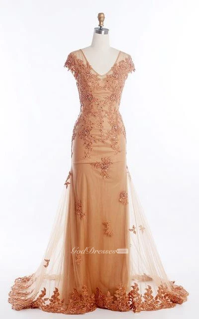 Cap Sleeve V-neck Long Mermaid Dress with Appliques