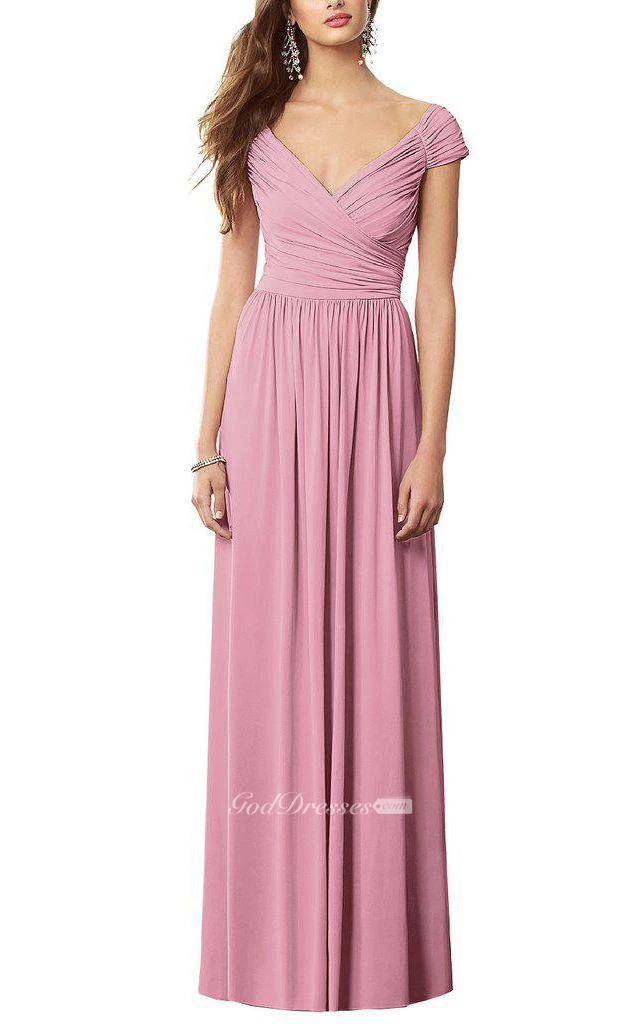 Cap Sleeve V-neck Ruched Long Chiffon Dress