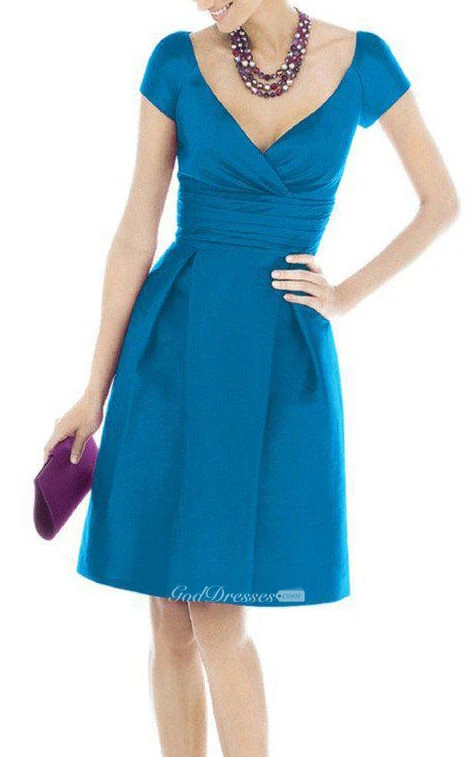 Cap Sleeve V-neck Short Satin Dress with Pleats
