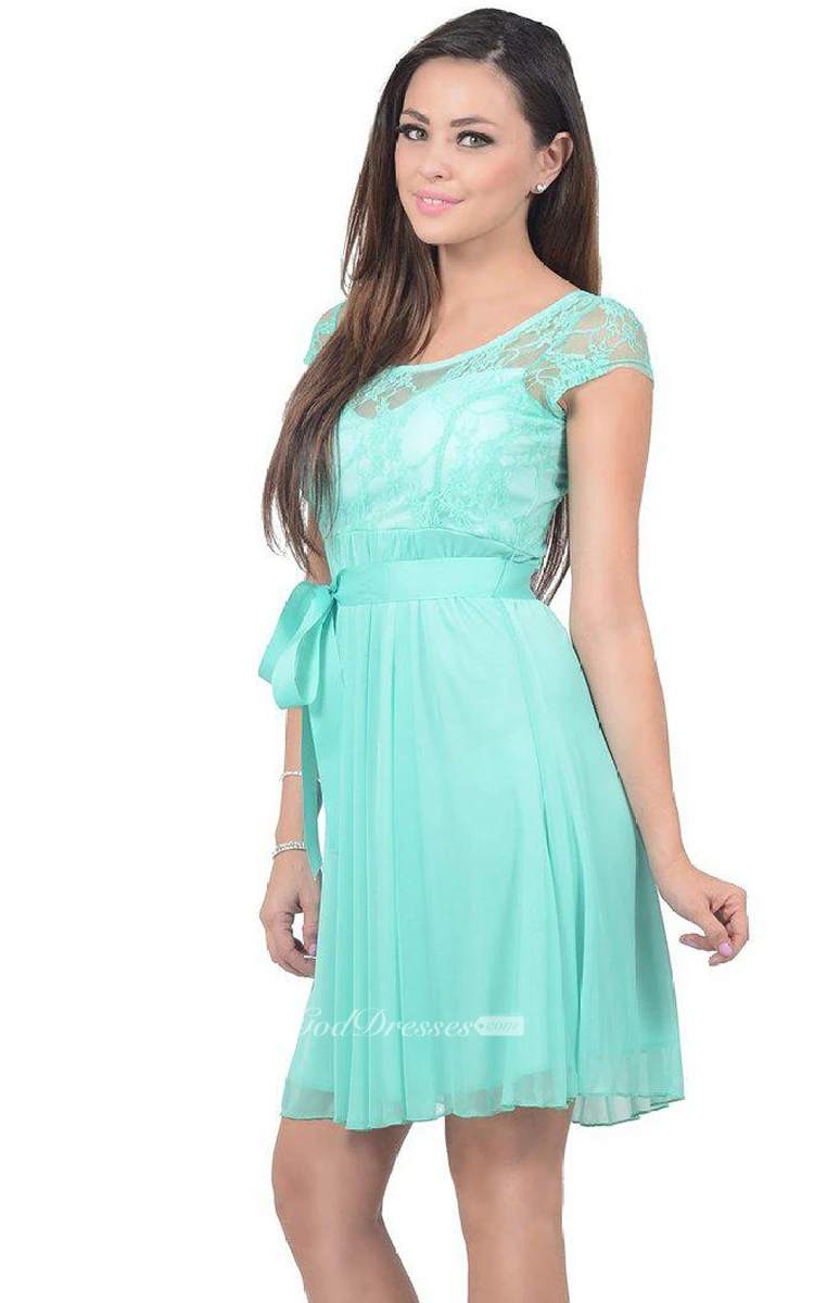 Cap-sleeved A-line Dress With Illusion Neckline and Bow