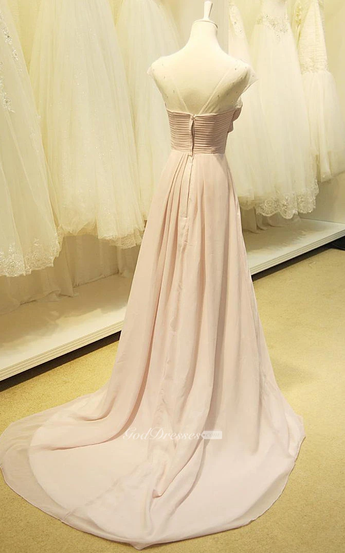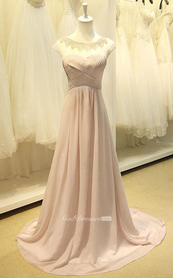 Cap-sleeved A-line Long Chiffon Dress with Illusion Neckline