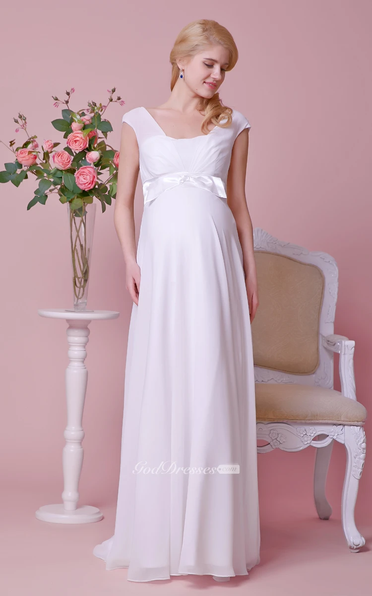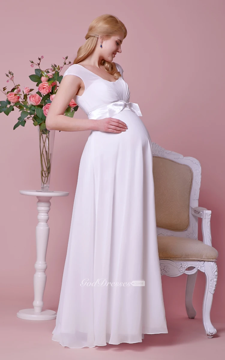 Cap-sleeved Empire Waist A-line Chiffon Floor Length Dress With Front Bow