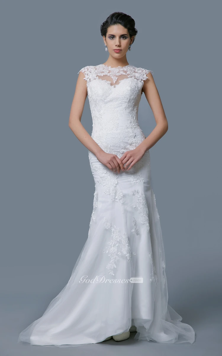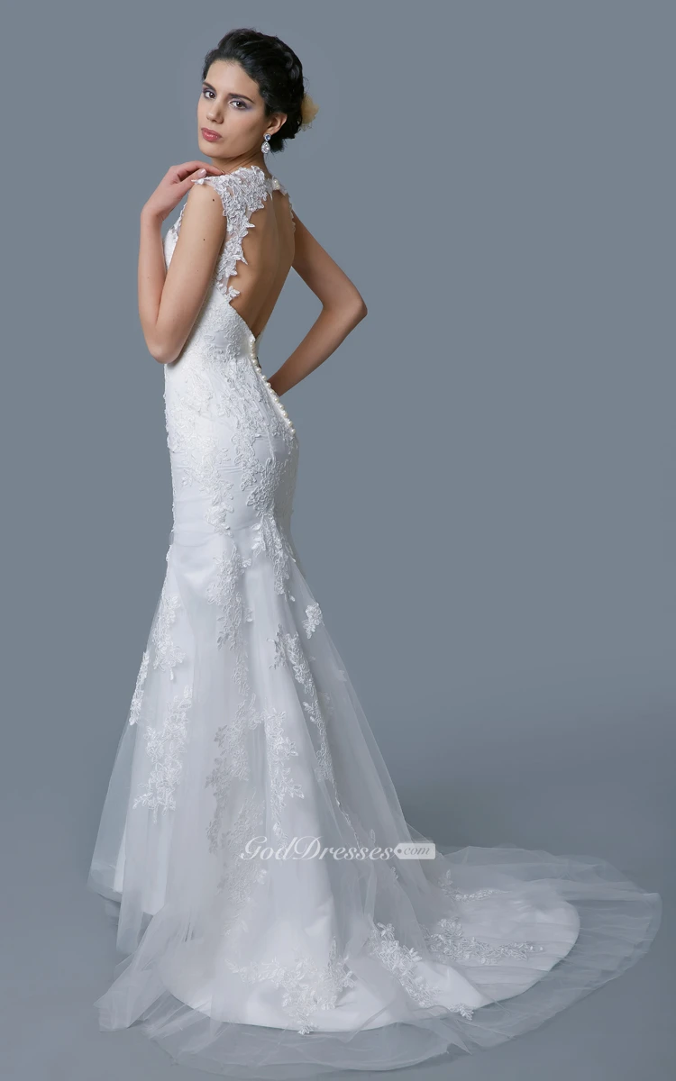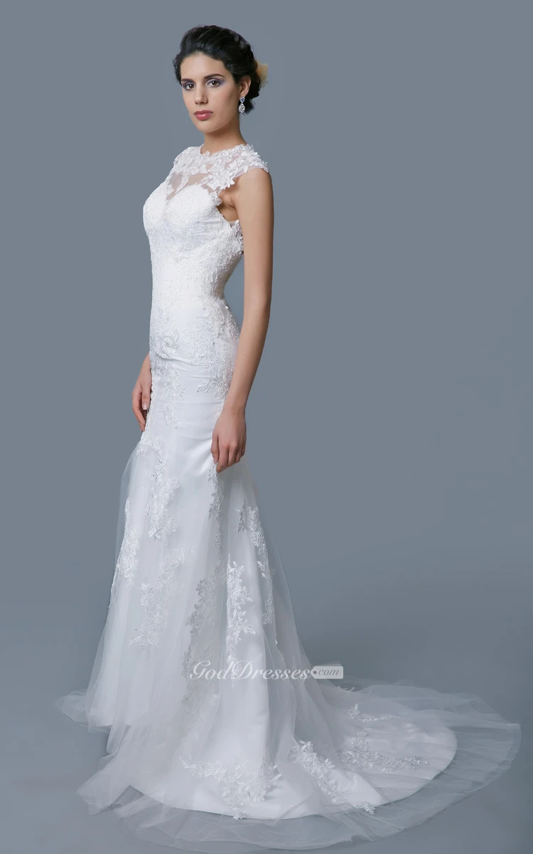 Cap-Sleeved Lace and Tulle Mermaid Dress With Keyhole Back