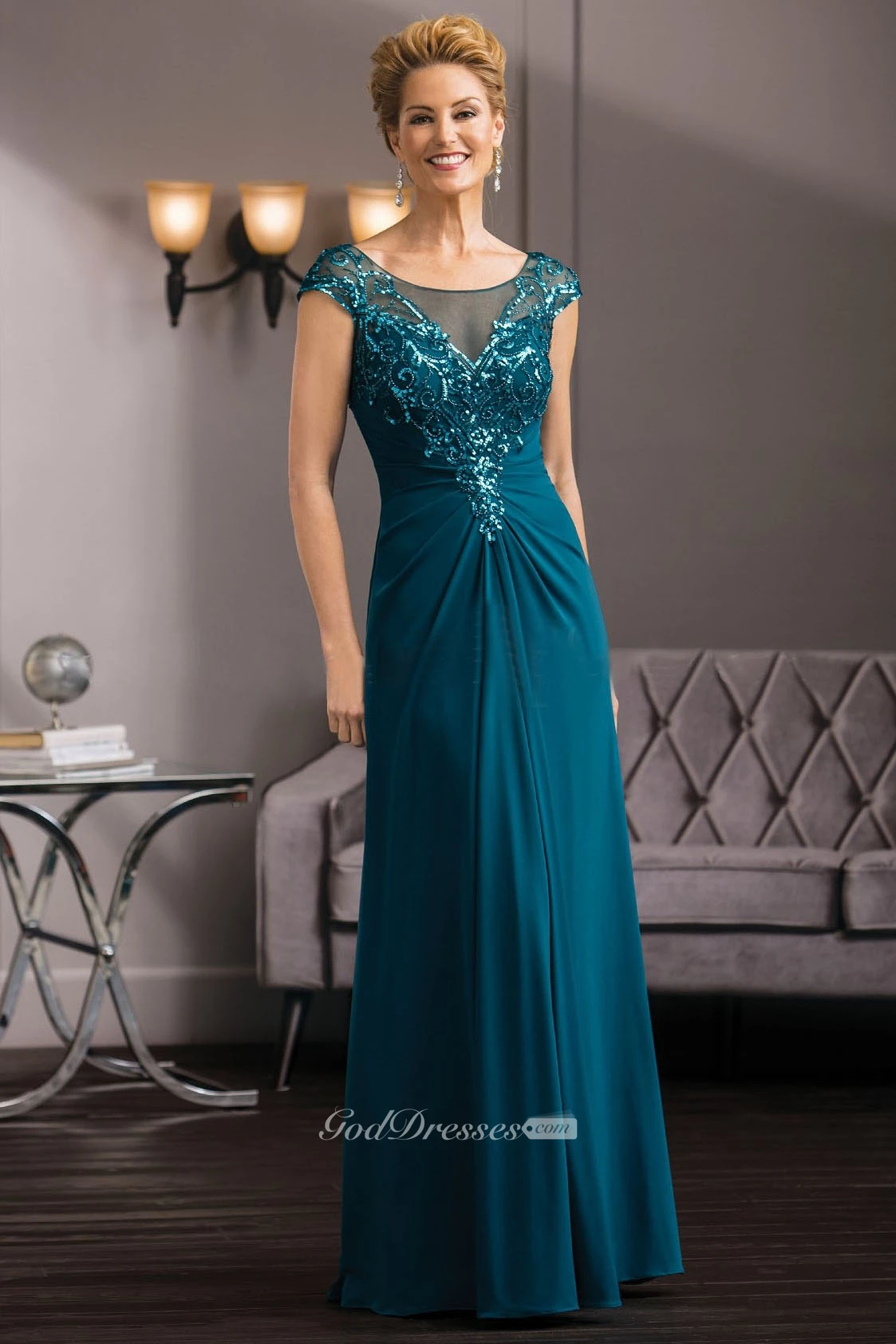 Cap-Sleeved Long Gown With Sequins And Illusion Back