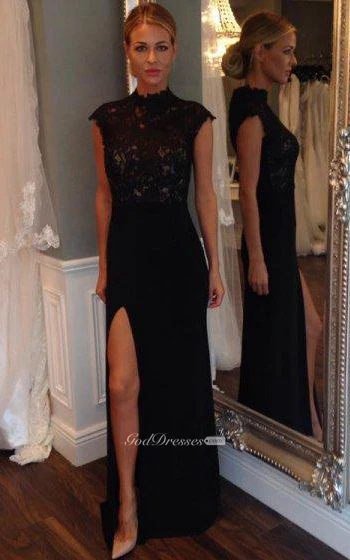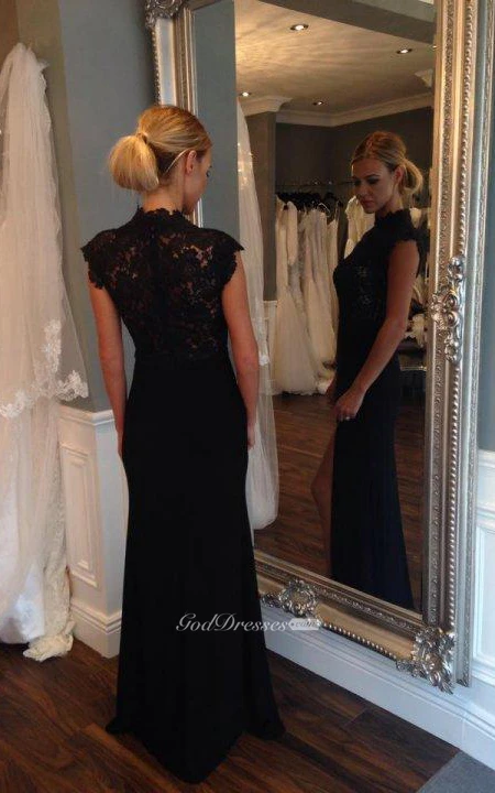 Cap-sleeved Long Lace Gown with Side Slit