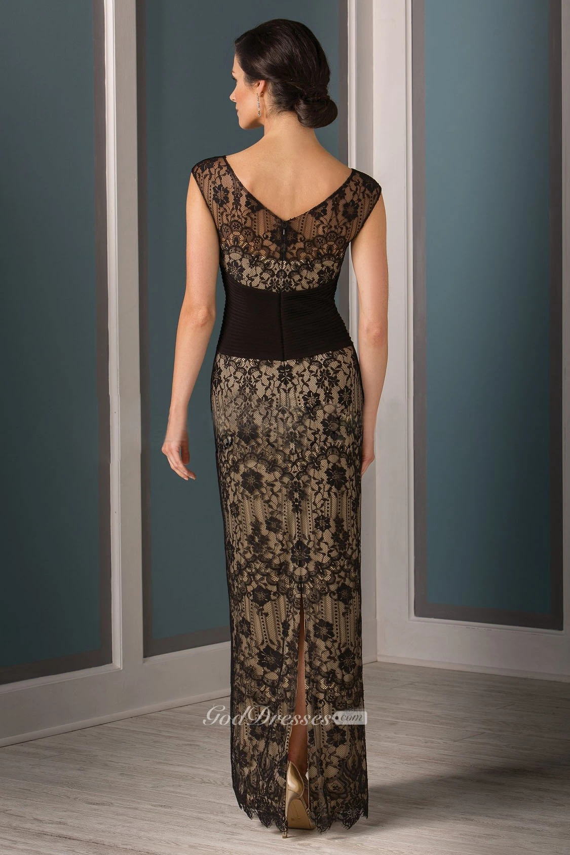 Cap-Sleeved Long Lace Sheath Mother Of The Bride Dress With Crisscross Ruches