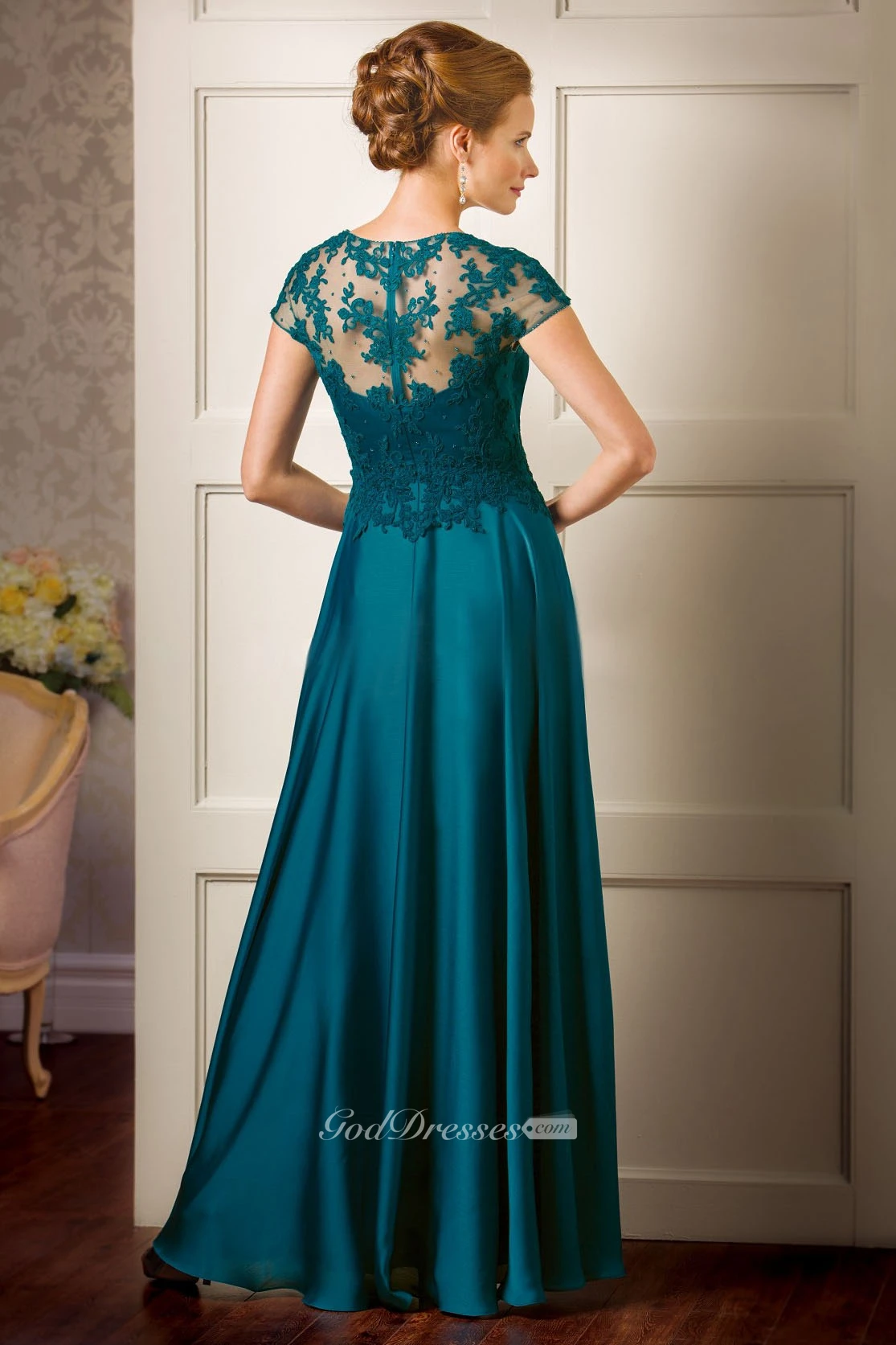 Cap-Sleeved Long Mother Of The Bride Dress With Appliques And Illusion Back