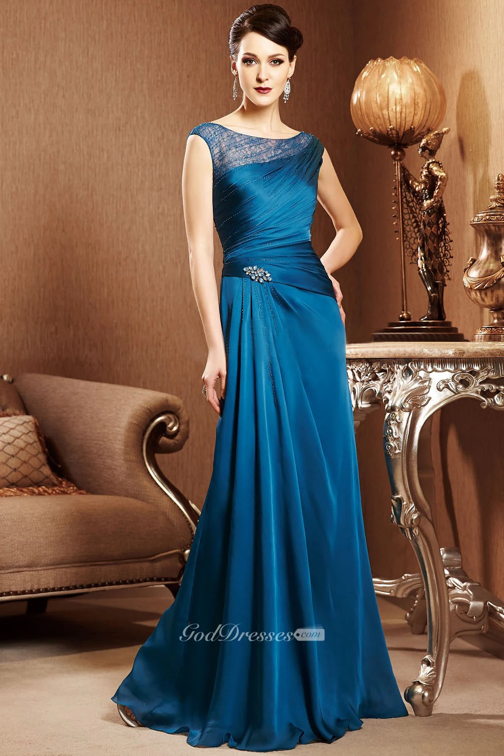 Cap-Sleeved Long Mother Of The Bride Dress With Crystals And Ruching
