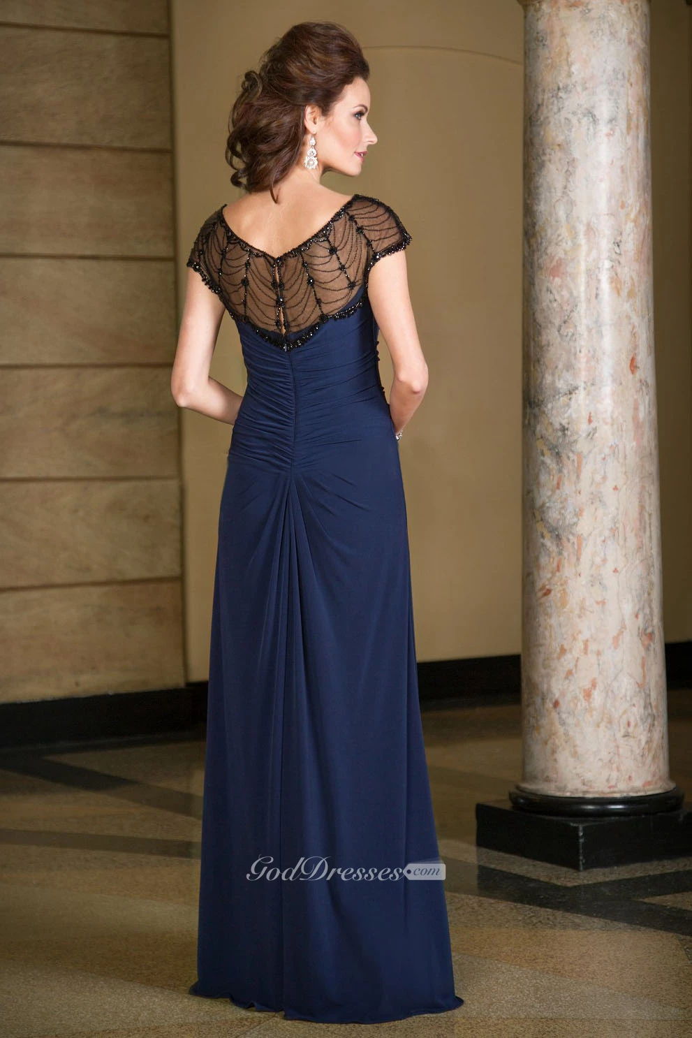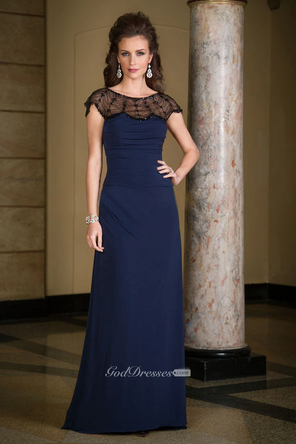 Cap-Sleeved Long Mother Of The Bride Dress With Illusion Beaded Neck