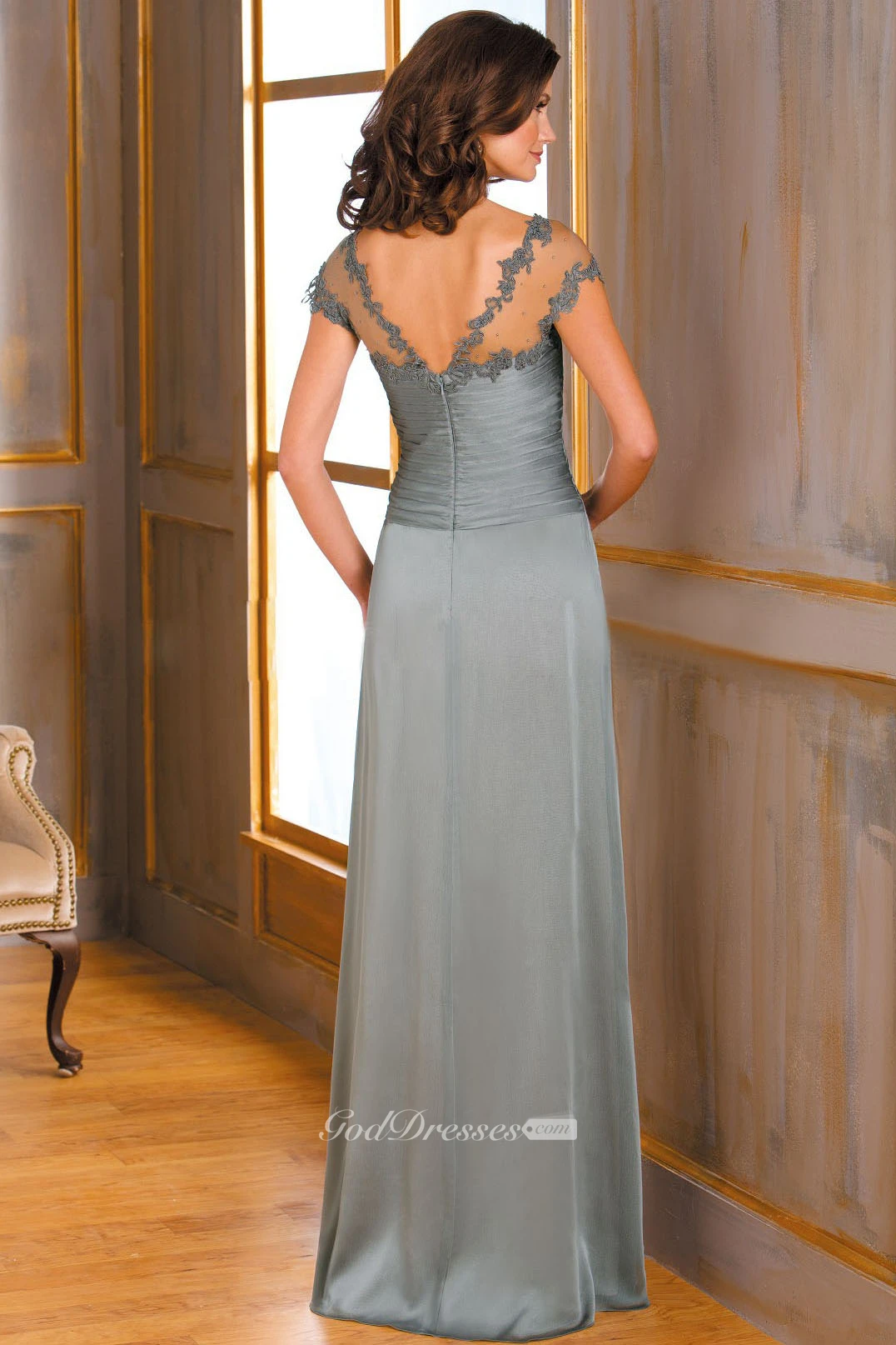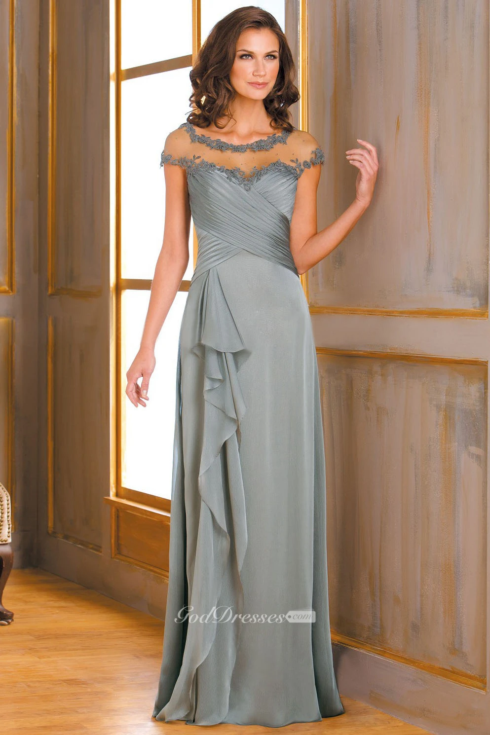 Cap-Sleeved Long Mother Of The Bride Dress With Ruffles And Illusion Appliqued Neck