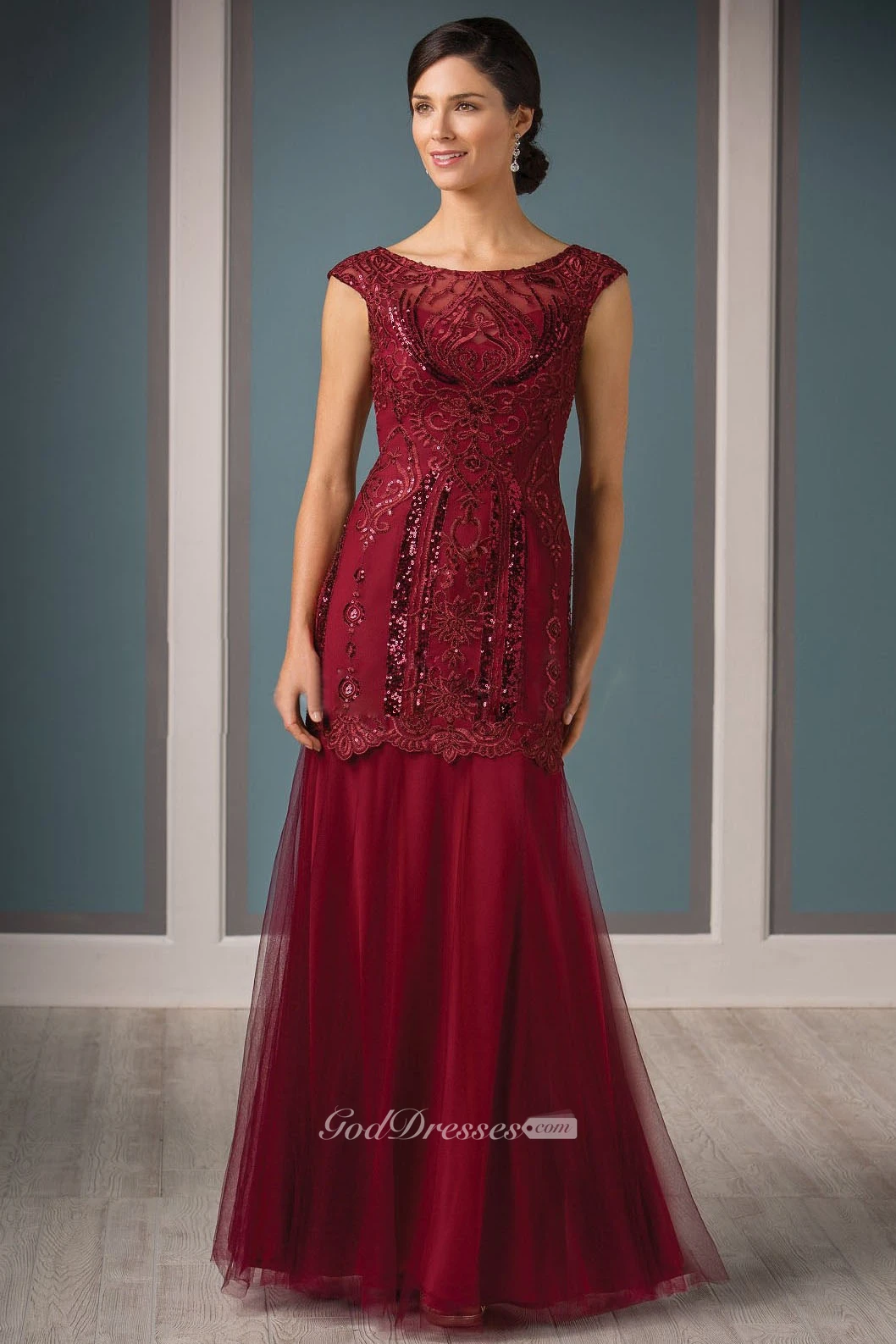 Cap-Sleeved Long Mother Of The Bride Dress With Sequins And Embroidery