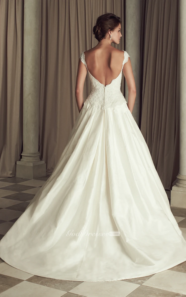 Cap-Sleeved Long Satin Dress With Lace Bodice