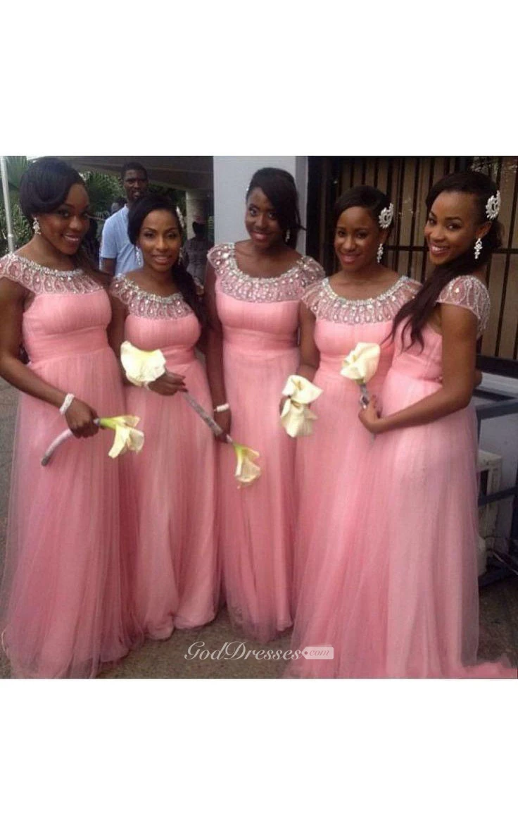Cap-sleeved Scoop-neck A-line Long Tulle Dress with Pleats