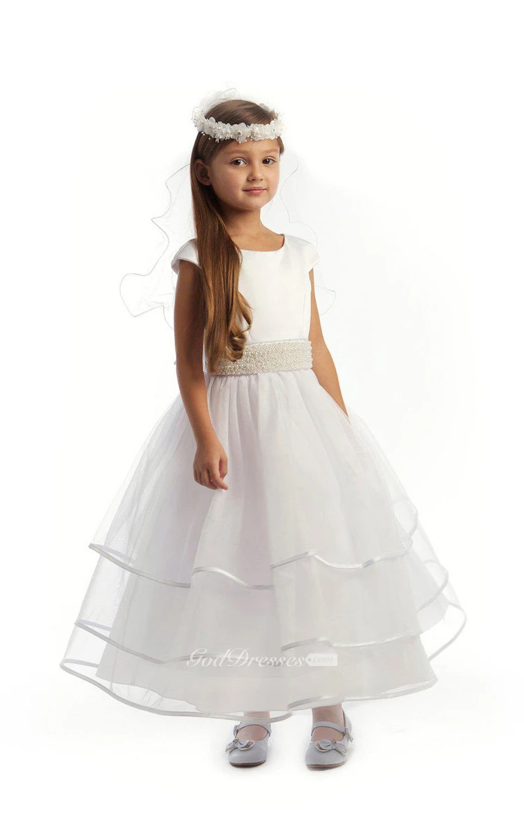 Cap-sleeved Scoop-neck A-line Tiered Organza Dress With Beadings