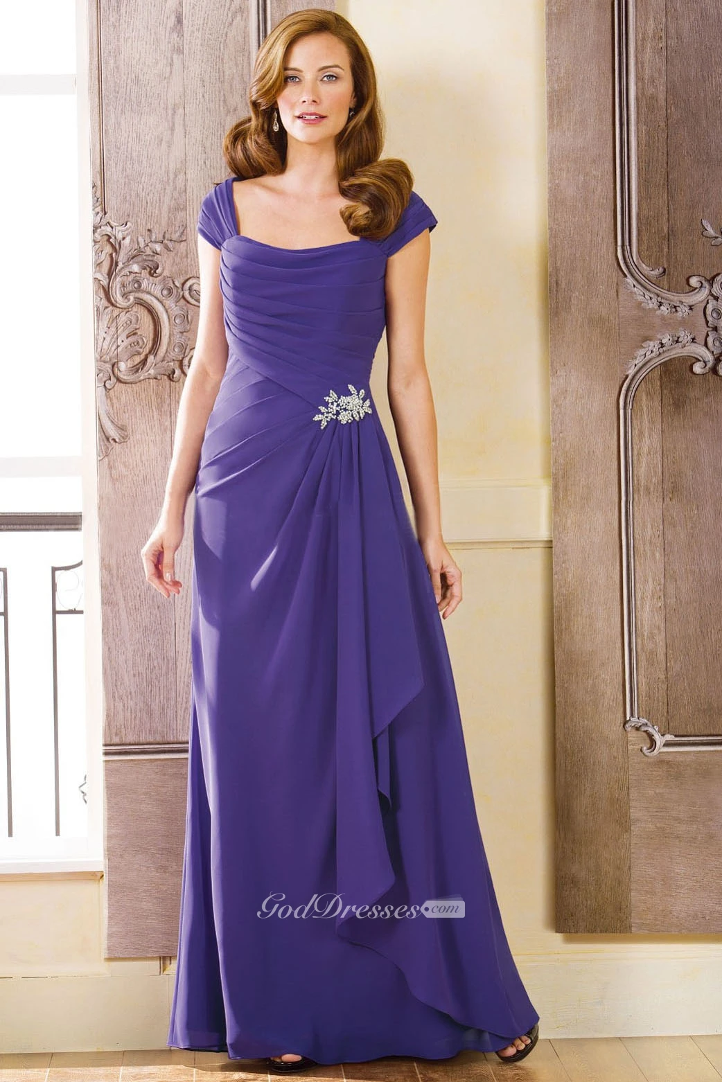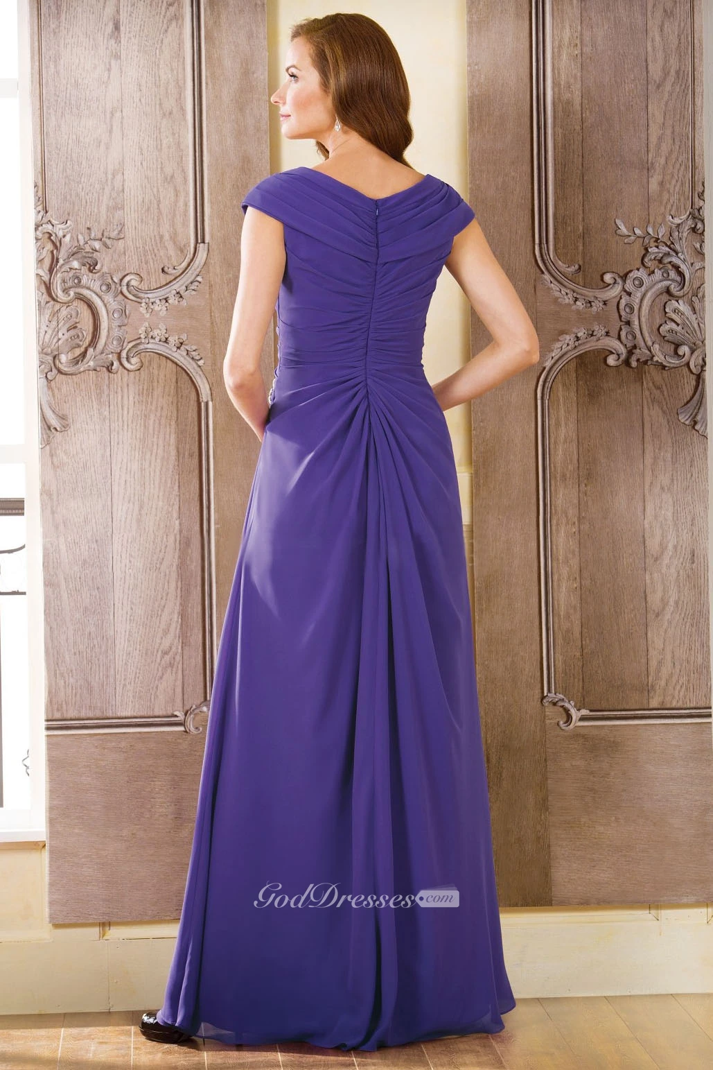 A-Line Floor-Length Cap Chiffon Broach Draping Ruching Zipper Dress