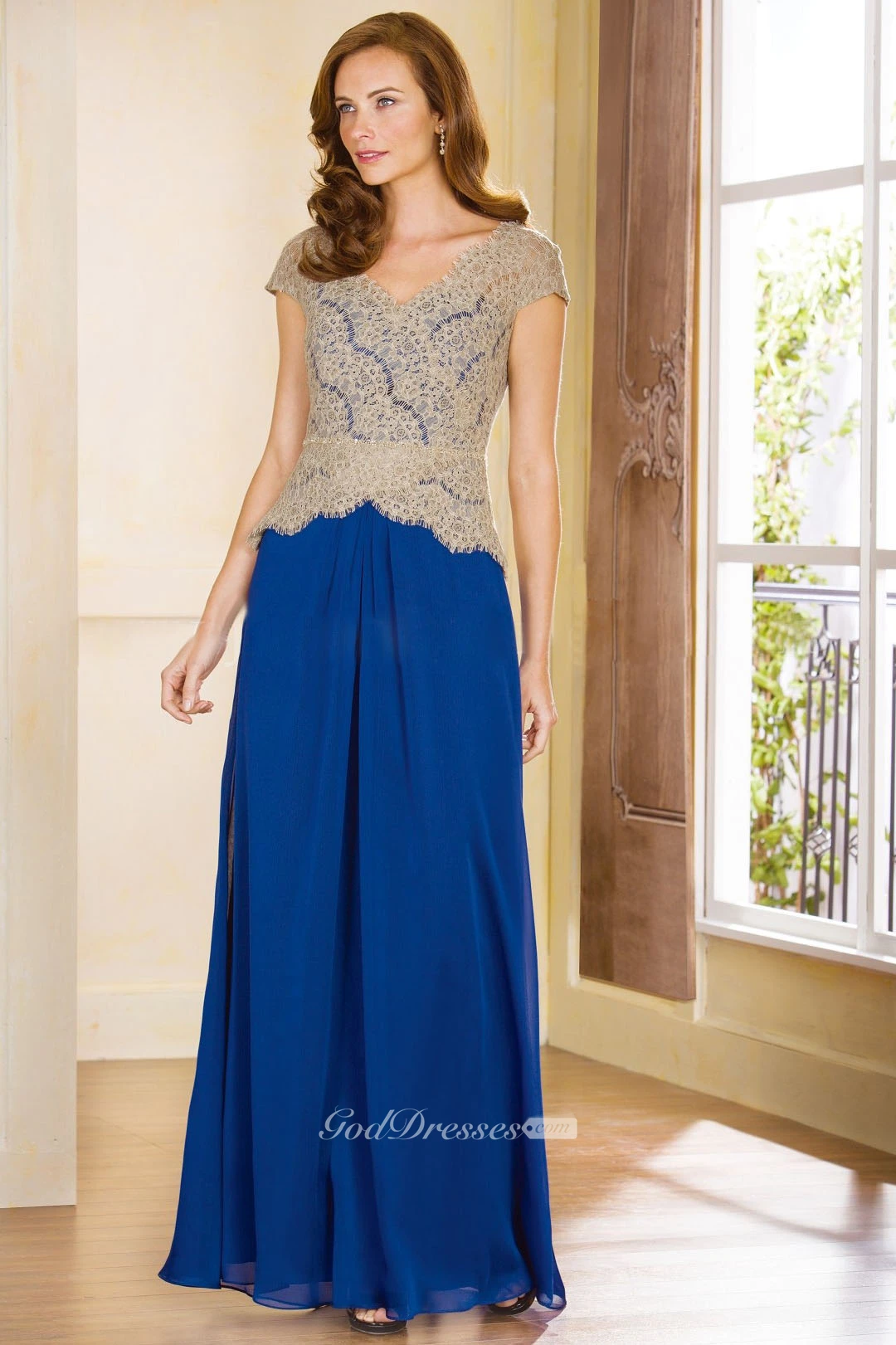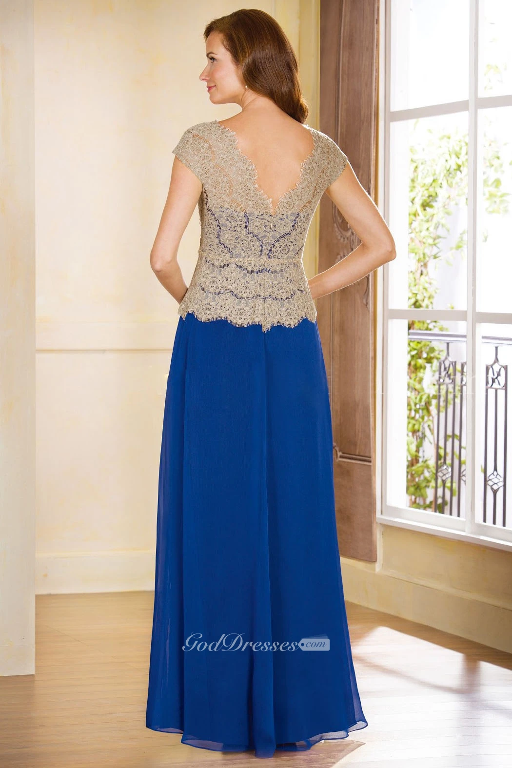 Cap-Sleeved V-Neck Long Chiffon Mother Of The Bride Dress With Lace Bodice