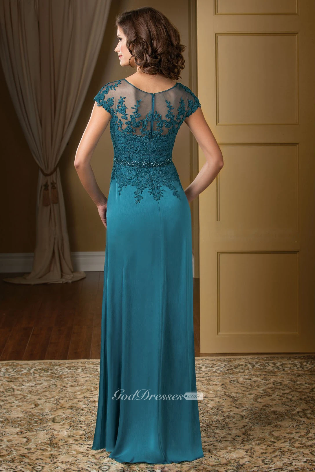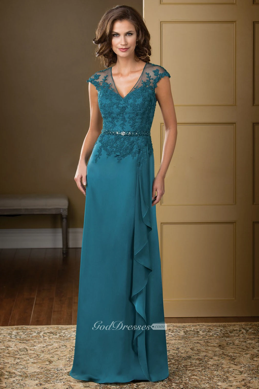 Cap-Sleeved V-Neck Long Gown With Ruffles And Crystals