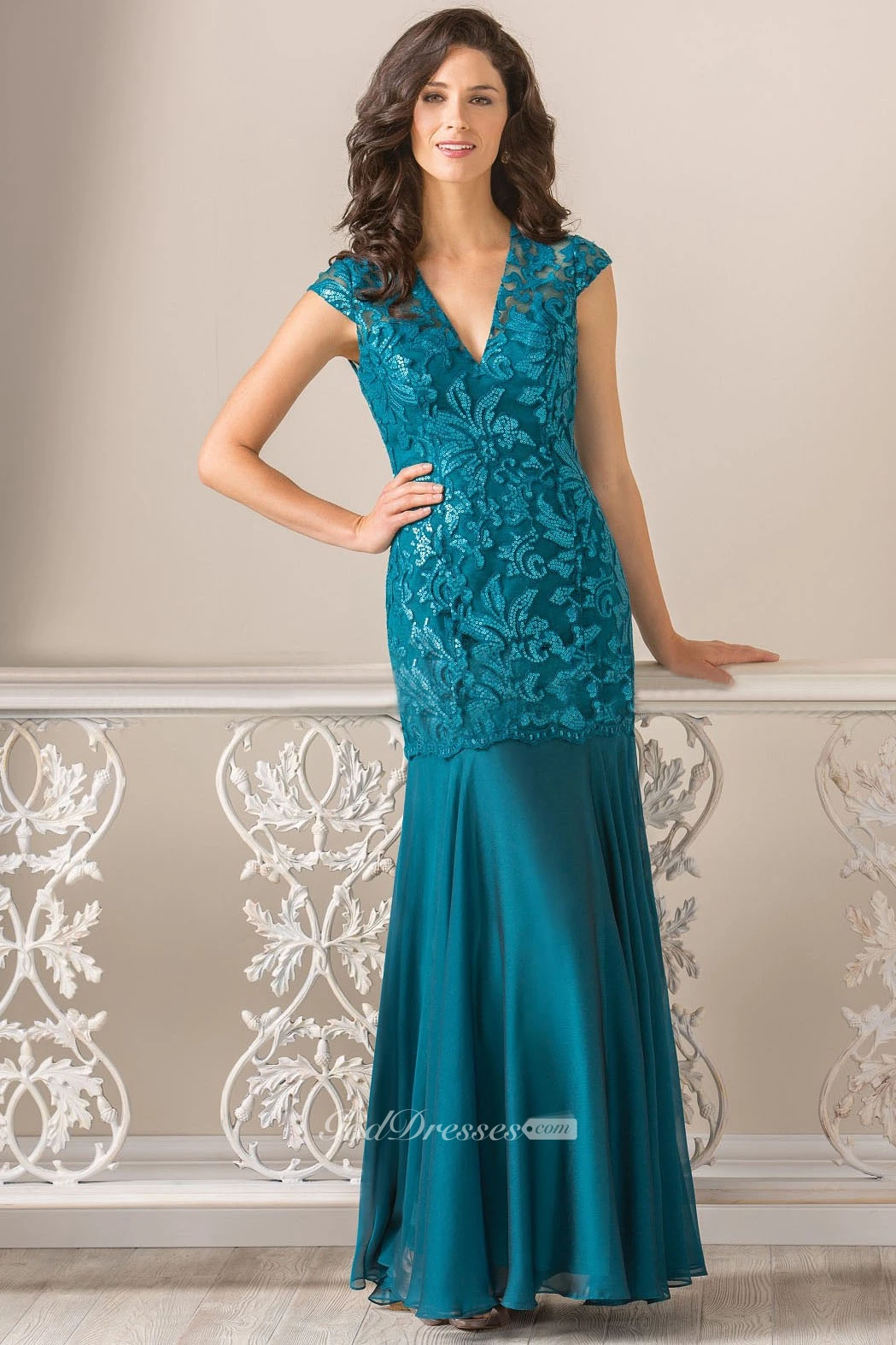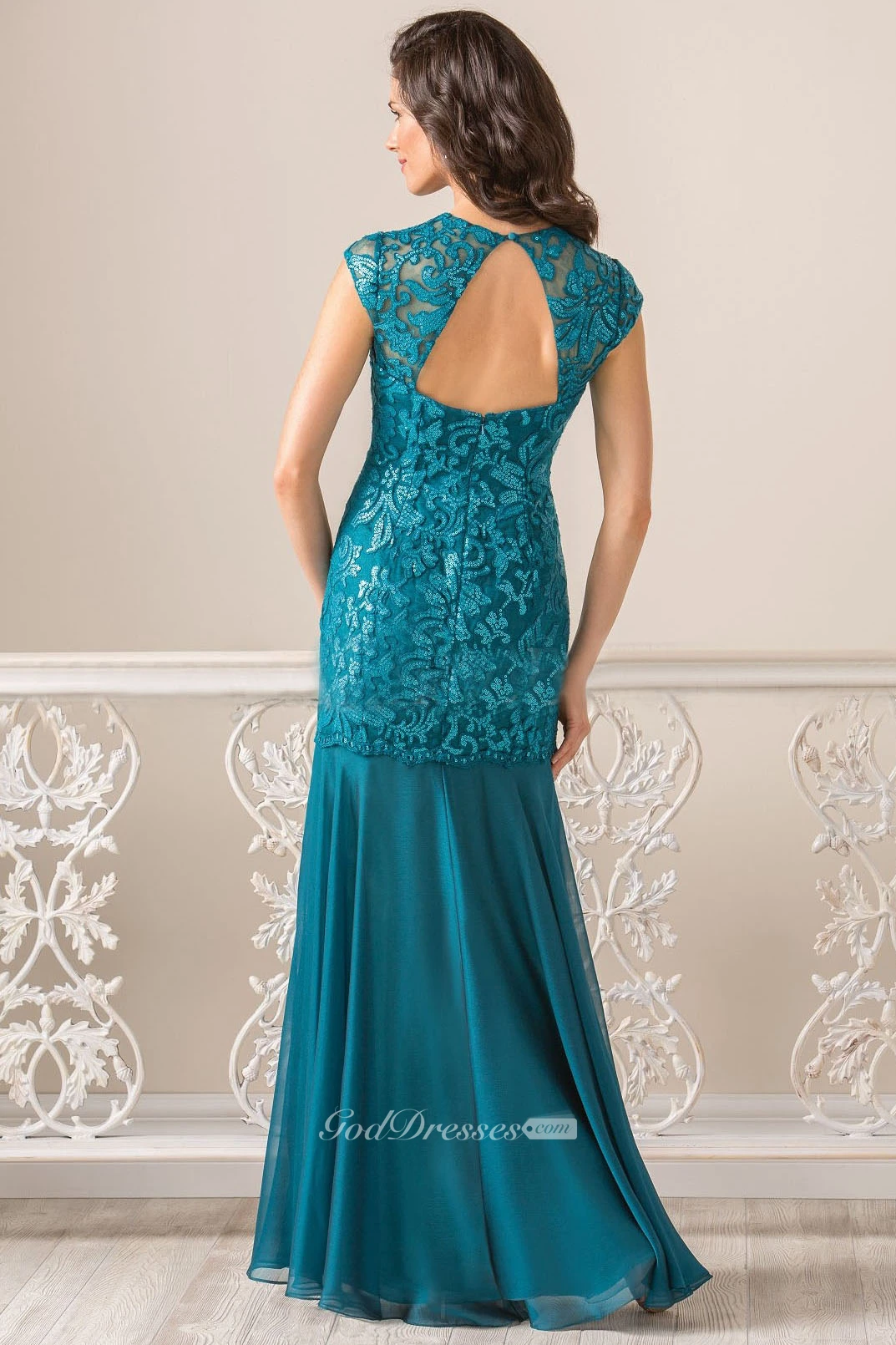 Cap-Sleeved V-Neck Long Mother Of The Bride Dress With Keyhole Back And Dropped Waistline