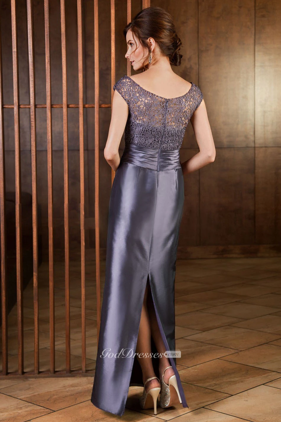 Cap-Sleeved V-Neck Long Sheath Mother Of The Bride Dress With Lace And Back Slit