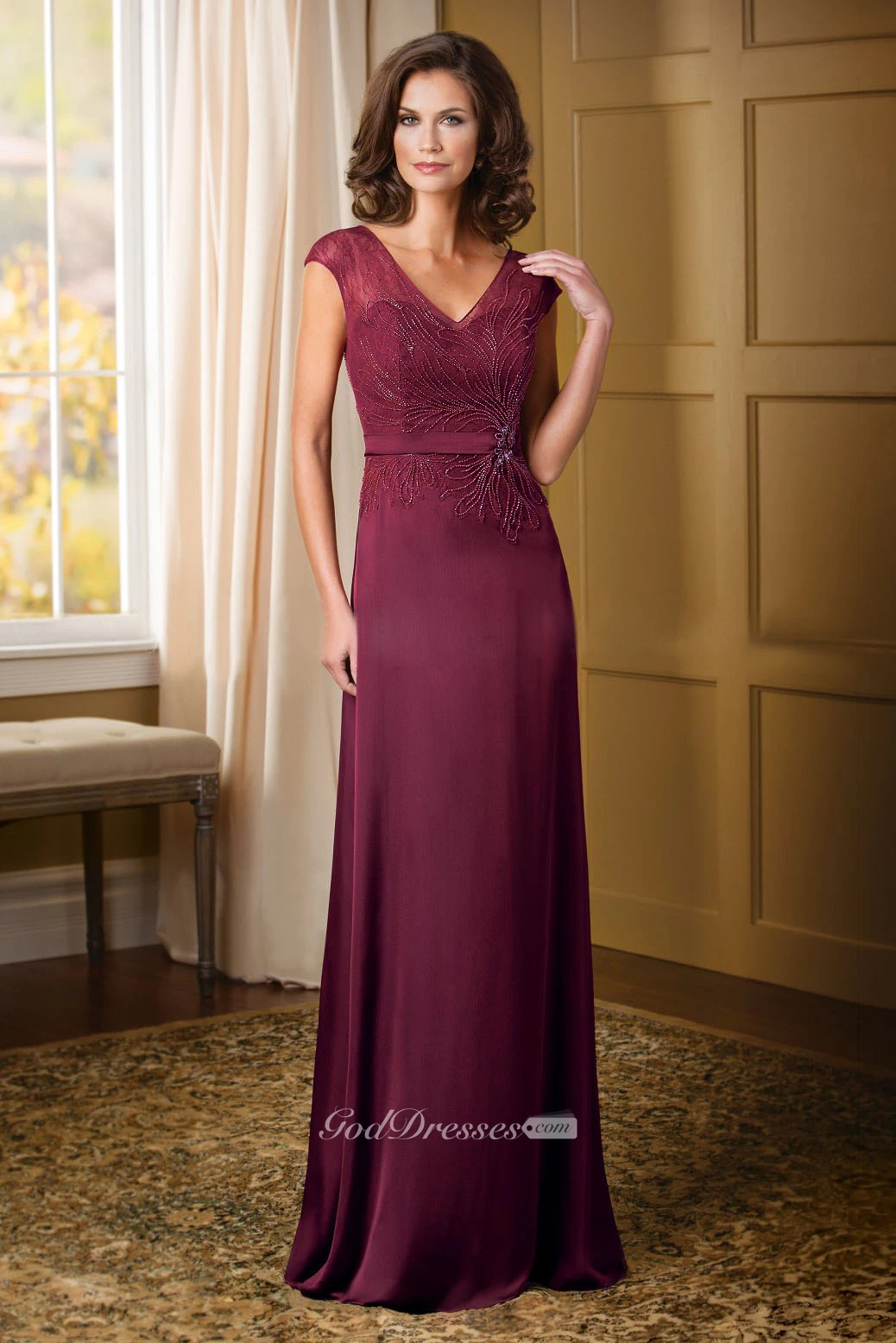 Cap-Sleeved V-Neck Mother Of The Bride Dress With Beadings And Lace Detail
