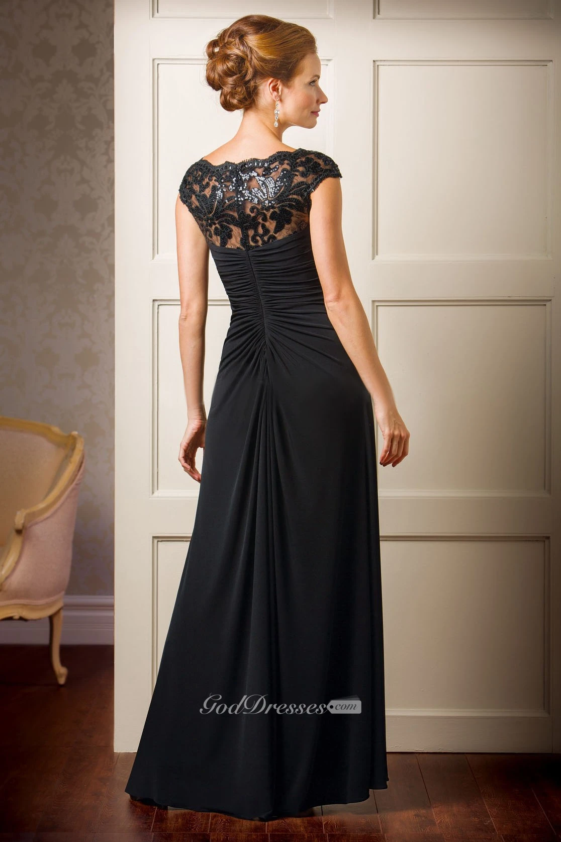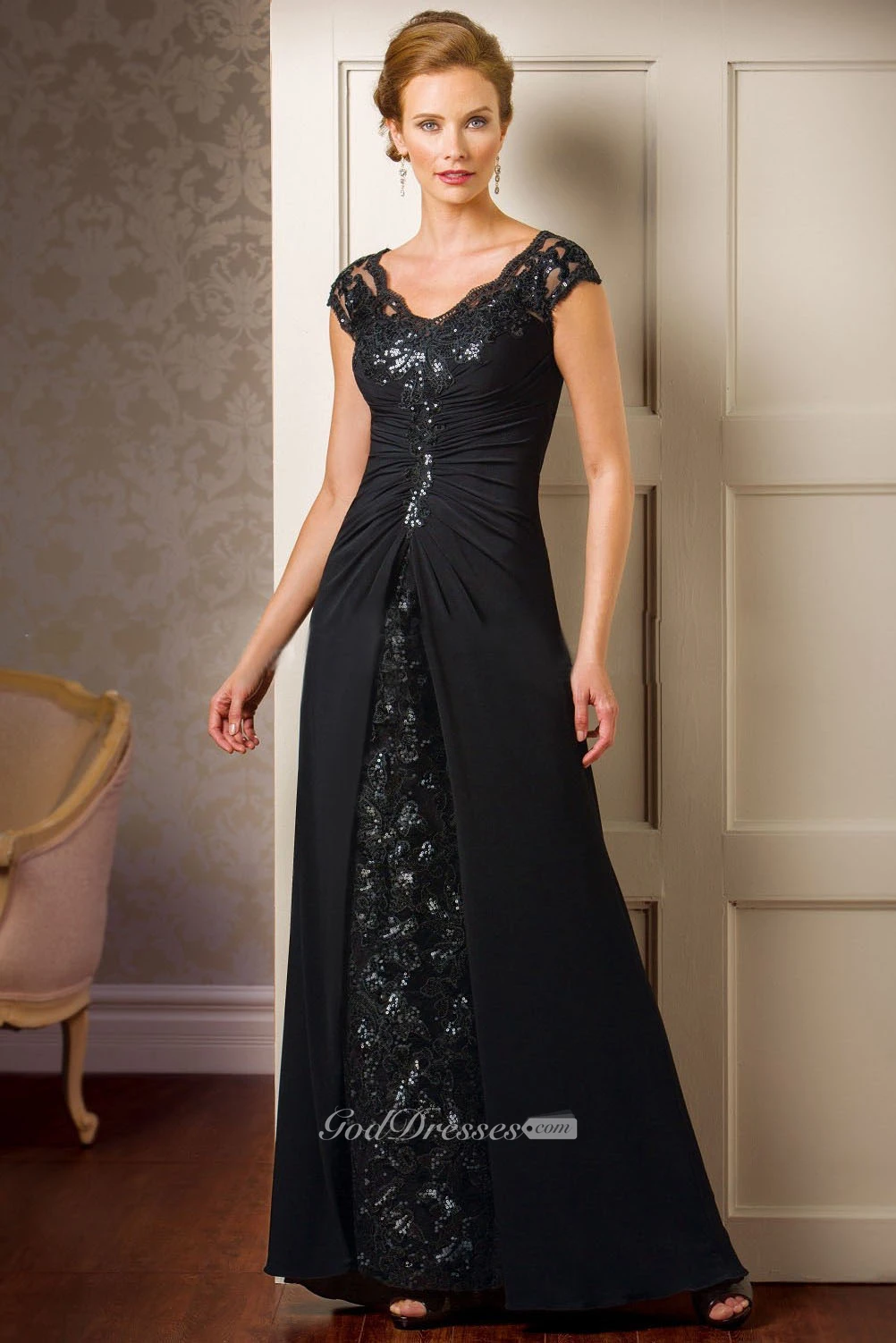 Cap-Sleeved V-Neck Mother Of The Bride Dress With Sequins And Illusion Back