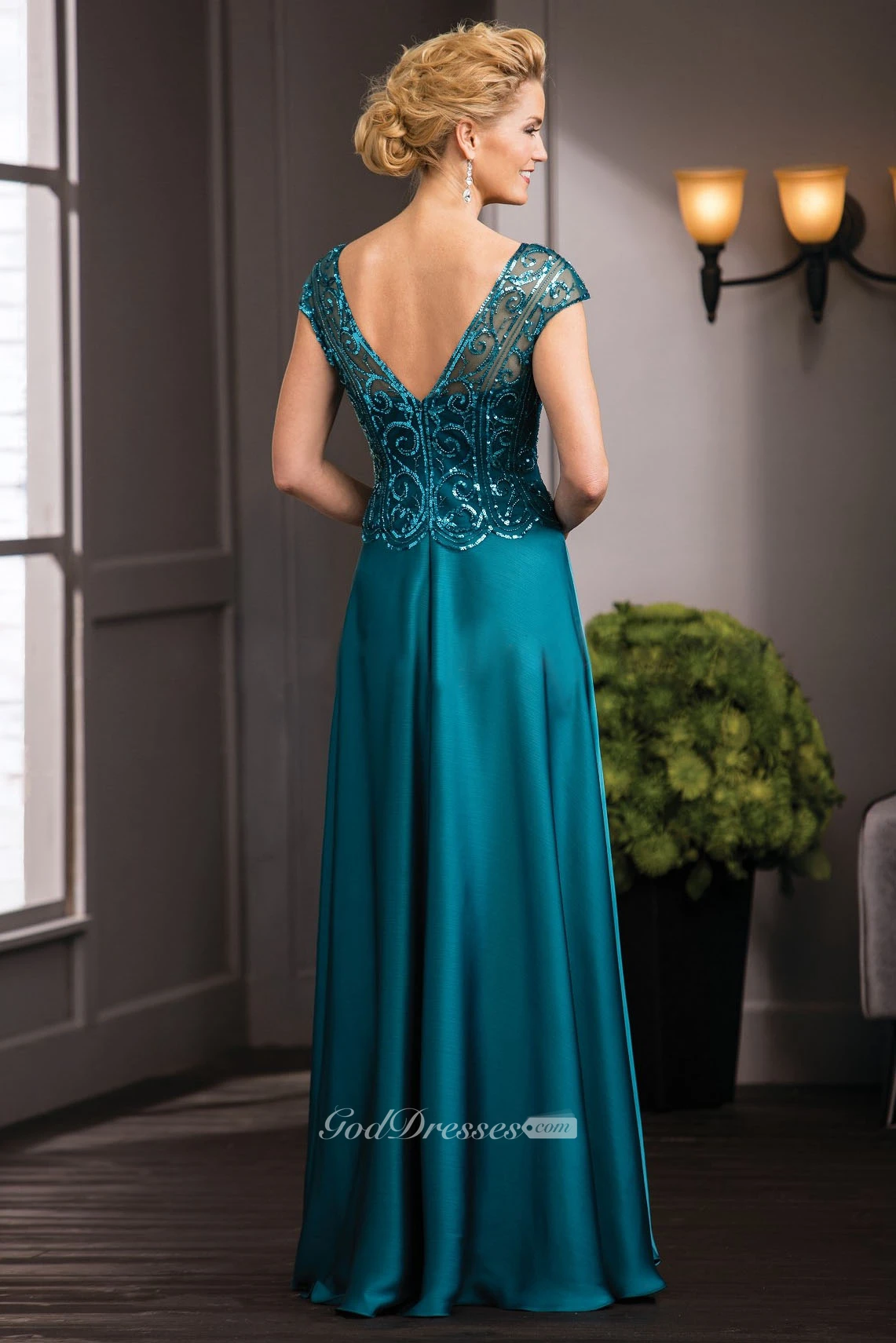 Cap-Sleeved V-Neck Mother Of The Bride Dress With Sequins And V-Back