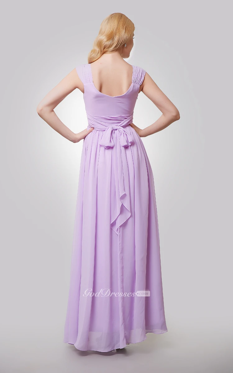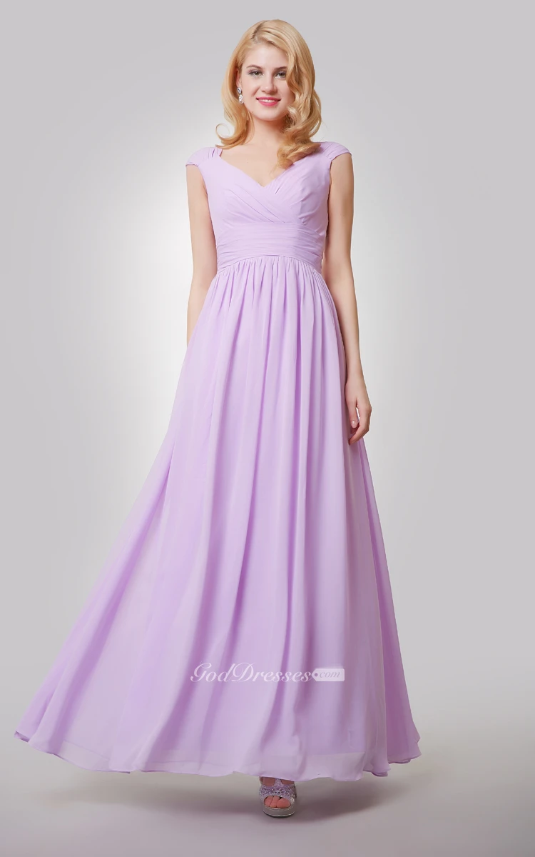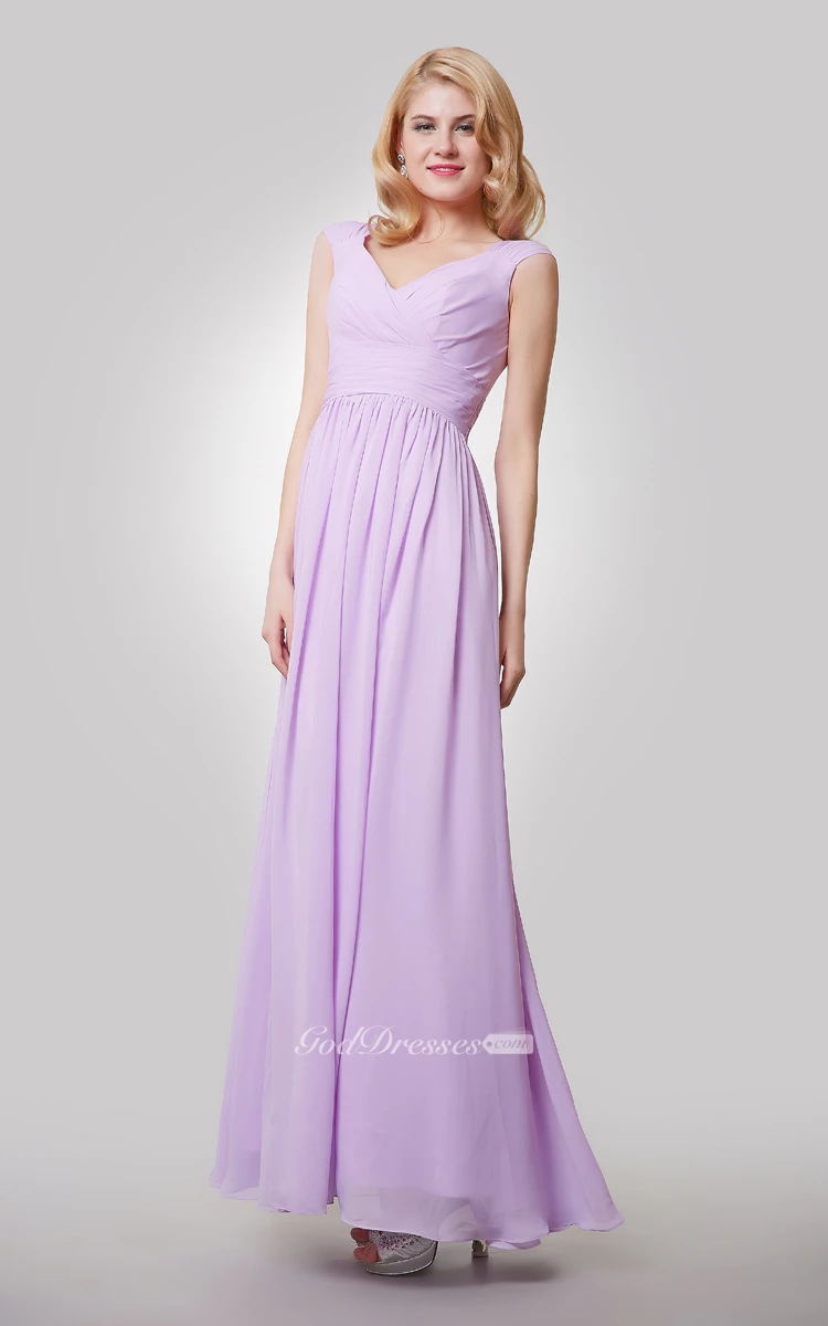 This vintage-style chiffon gown is elegant and timeless. The bodice is ruched with a shallow V-neck and cap sleeves. It meets the floor-length skirt at the natural waist. This A-line dress has a more billowing skirt than most, adding a little bit of volume to your silhouette. The dress is tied in the back with a wide chiffon bow.