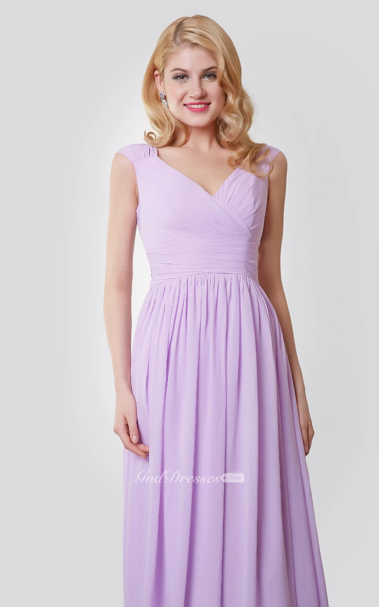 Cap-Sleeved V-Neck Pleated Chiffon Dress With Ruching and Back Bow