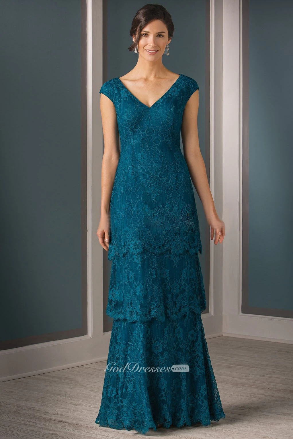 Cap-Sleeved V-Neck Tiered Lace Mother Of The Bride Dress With Pleats