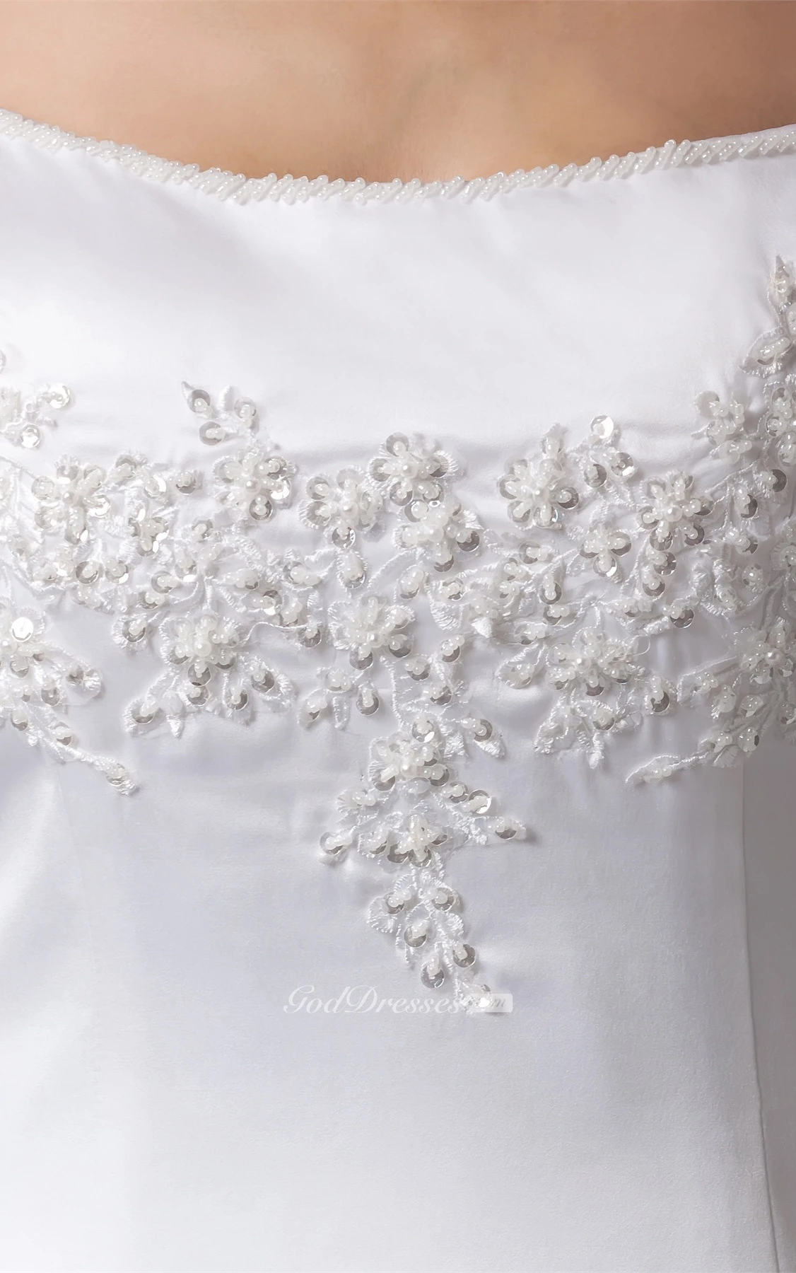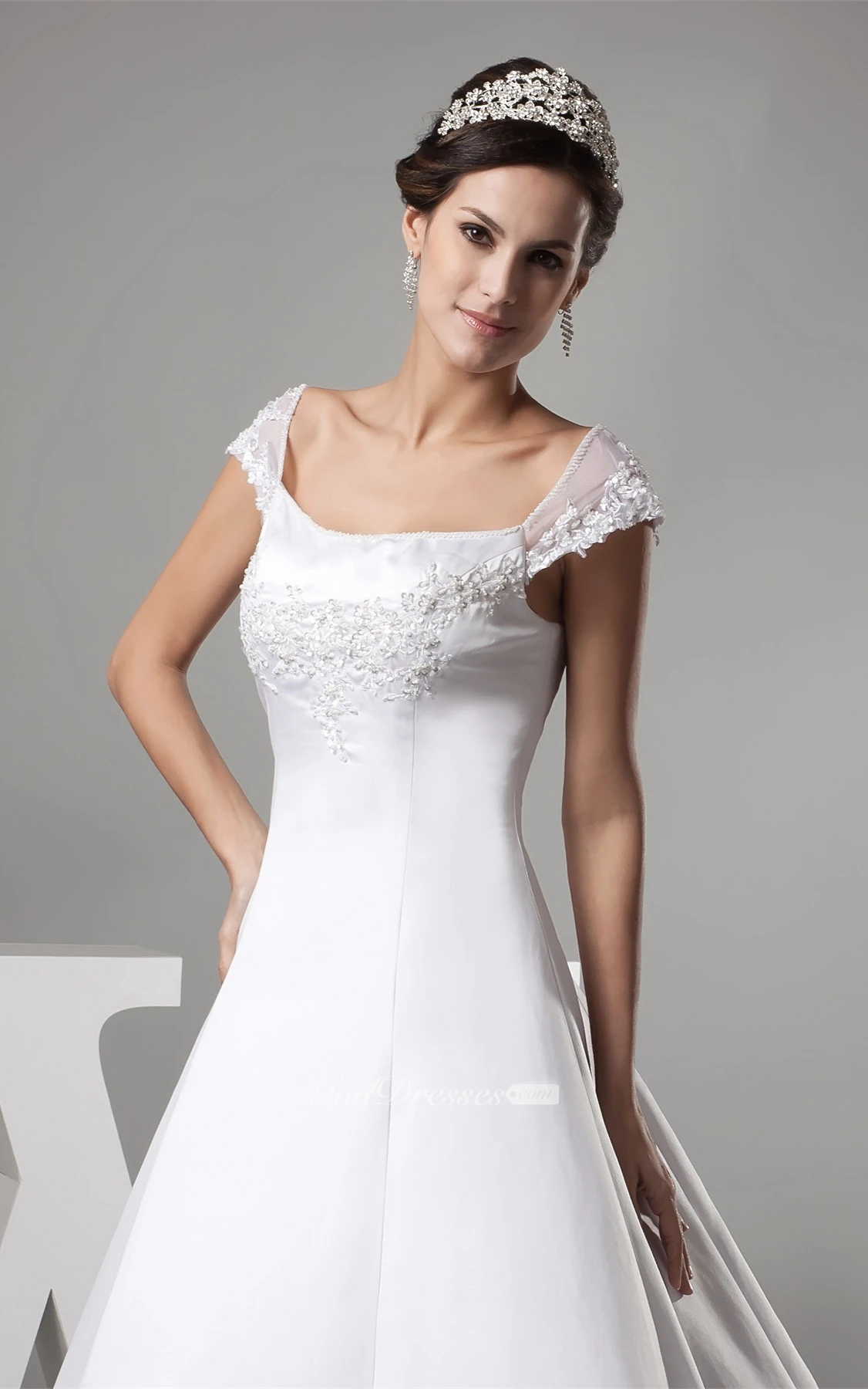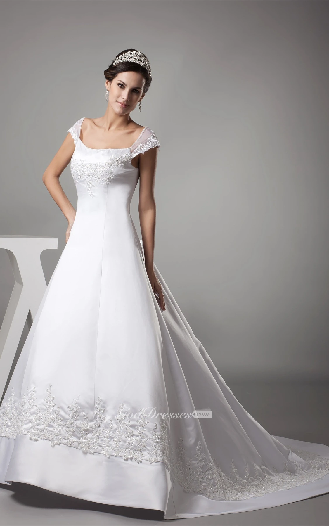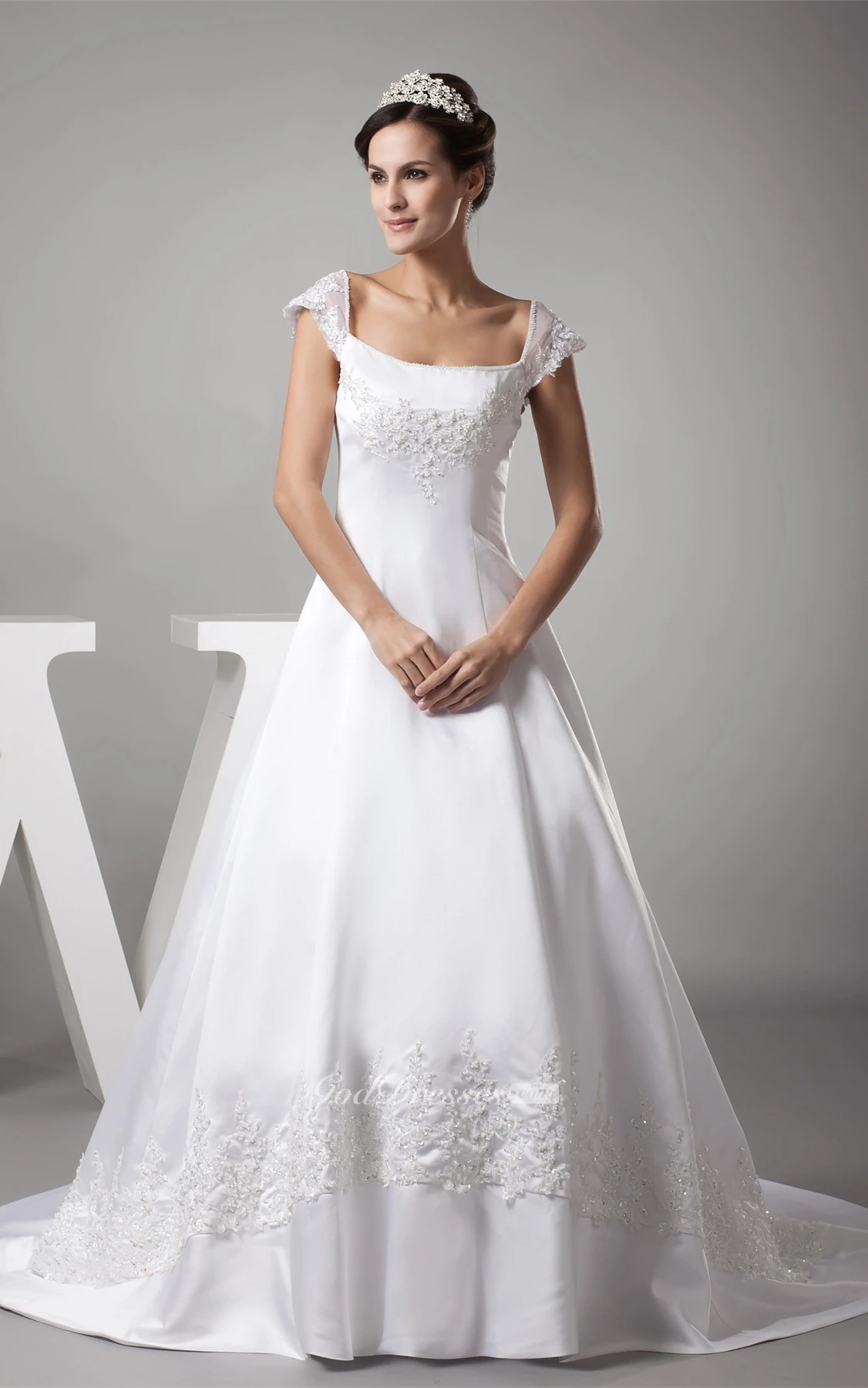 Caped-Sleeve A-Line Satin Gown With Appliques