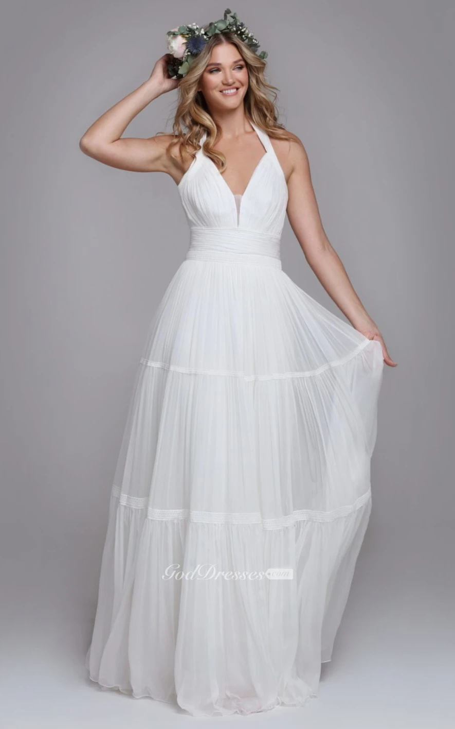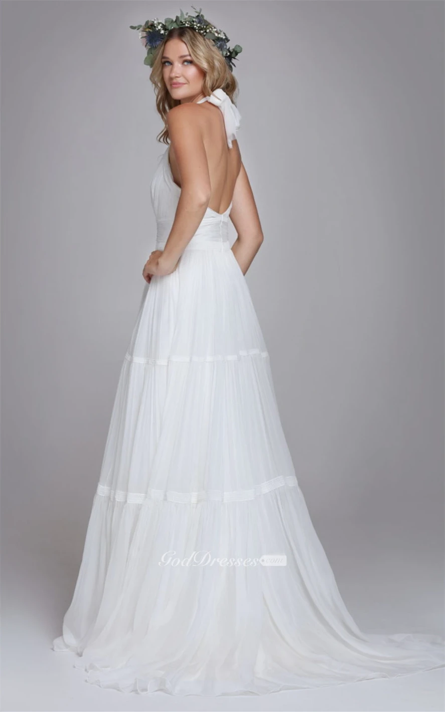 Casual A Line Halter Tulle Brush Train Wedding Dress with Ruching