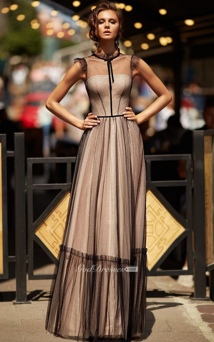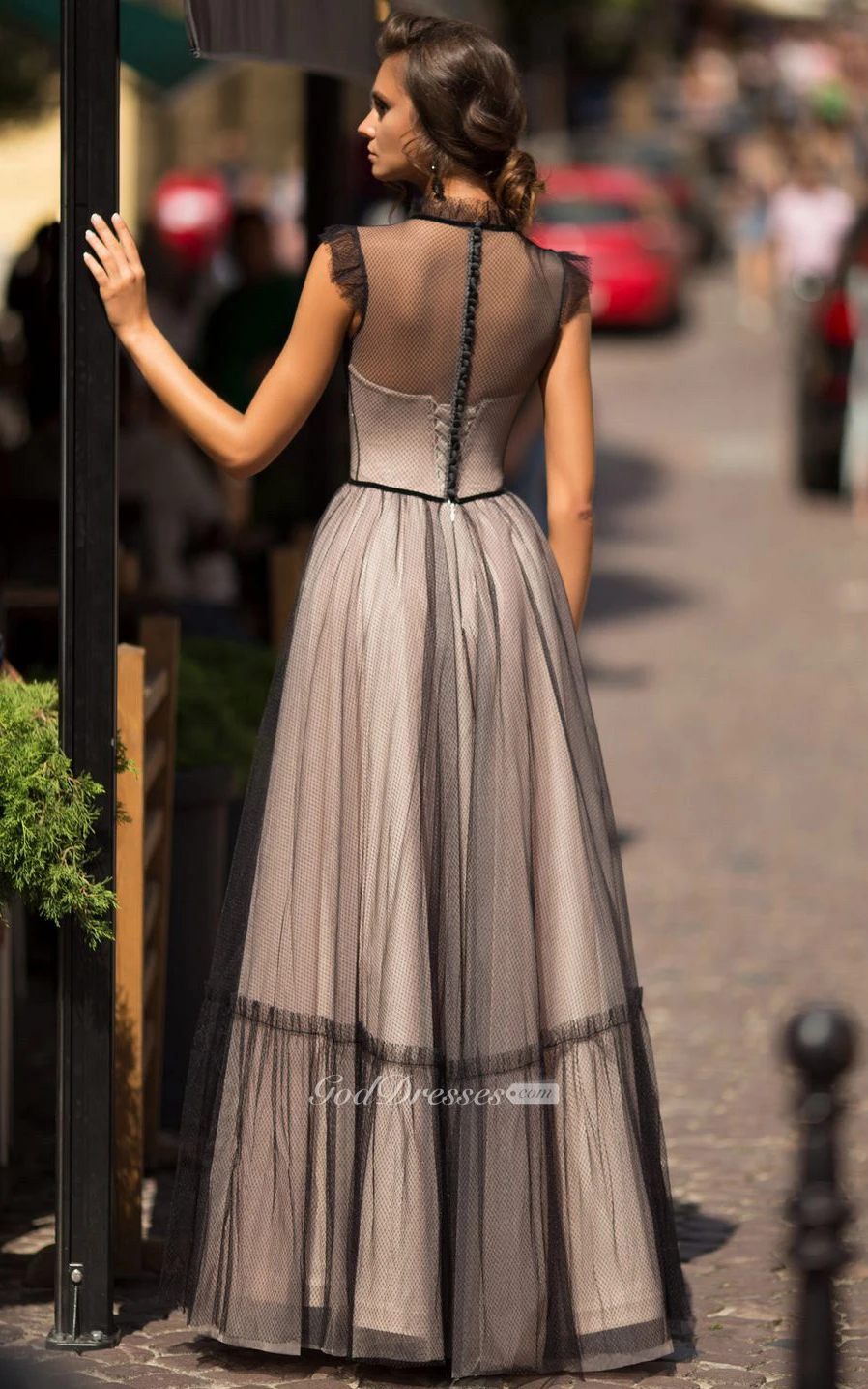 Casual A Line Tulle High Neck Floor-length Button Formal Dress with Bow