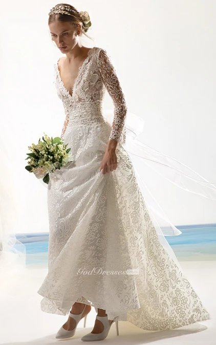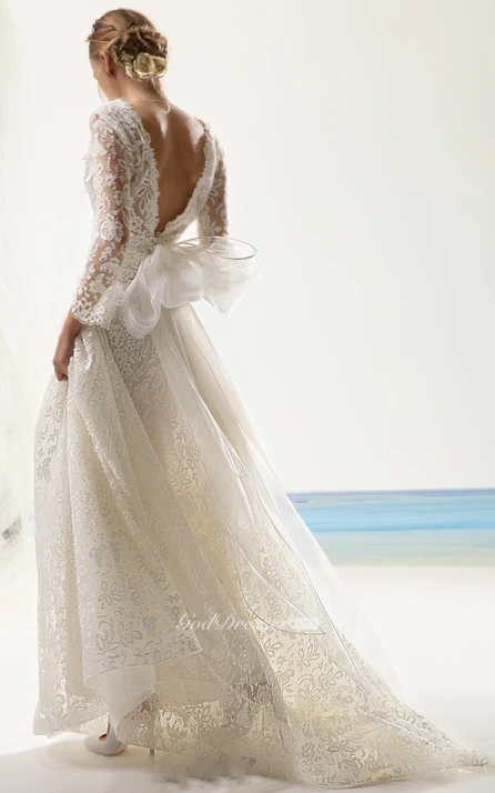 Casual Illusion V-neck A Line Lace Brush Train Long Sleeve Wedding Dress with Bow
