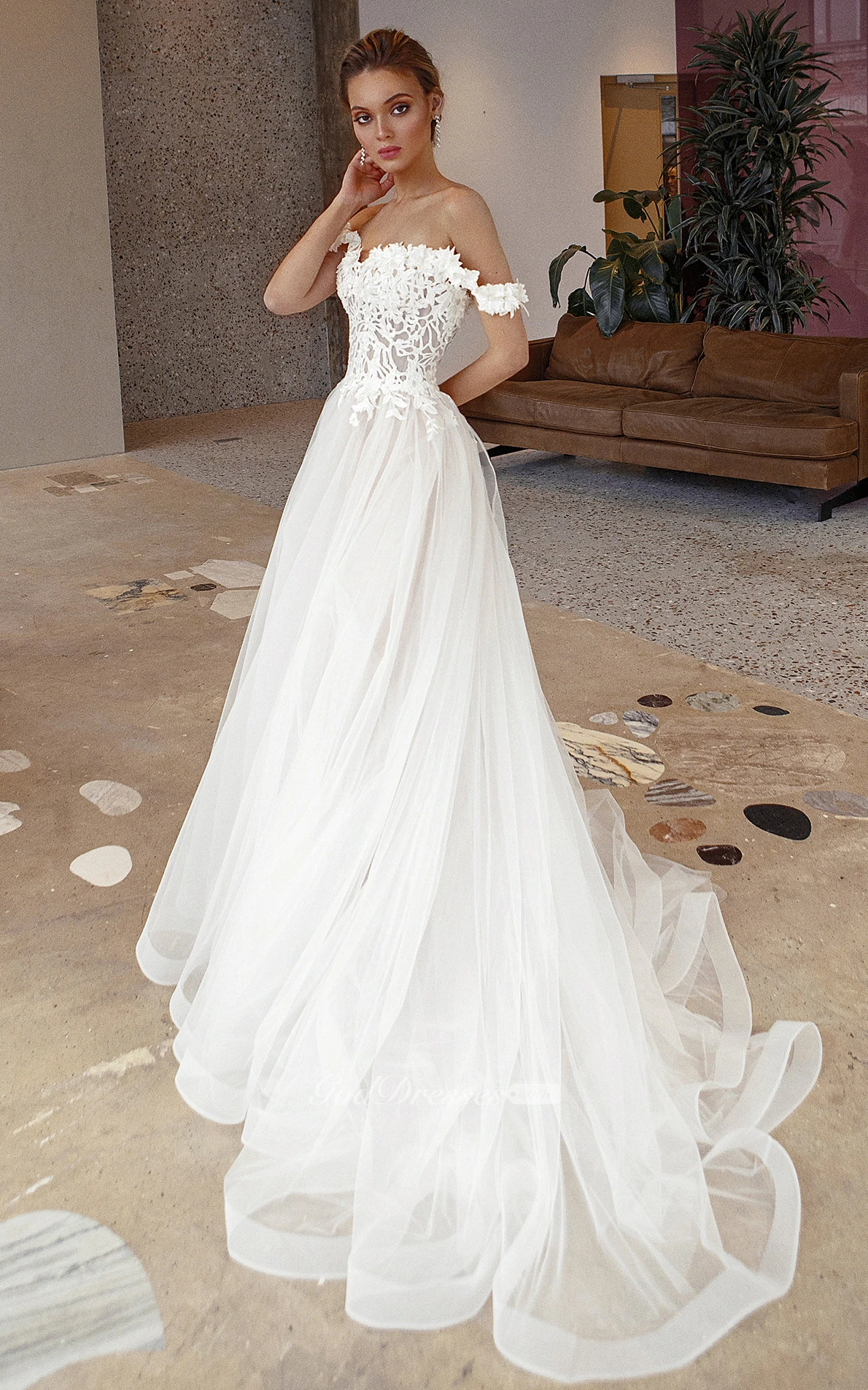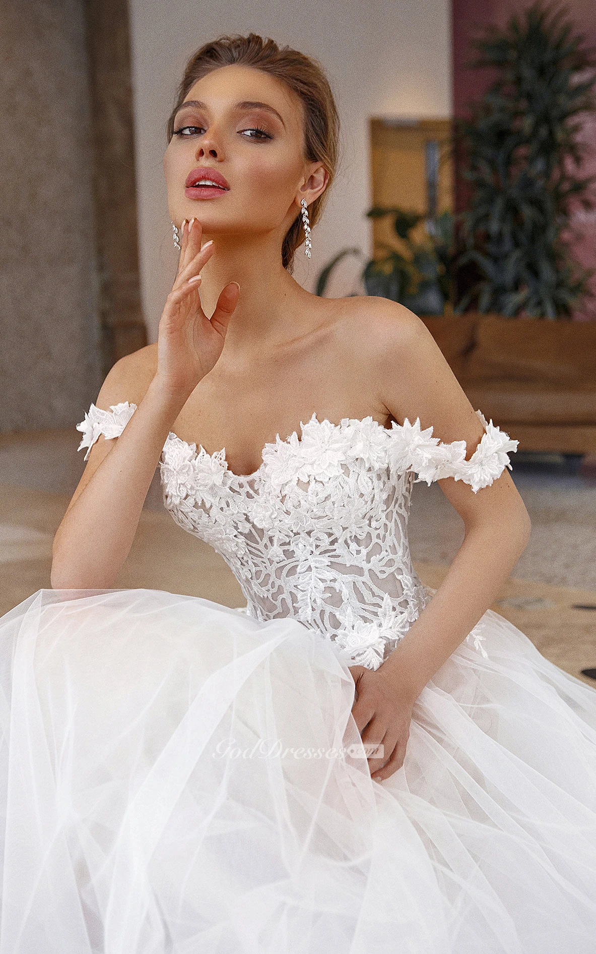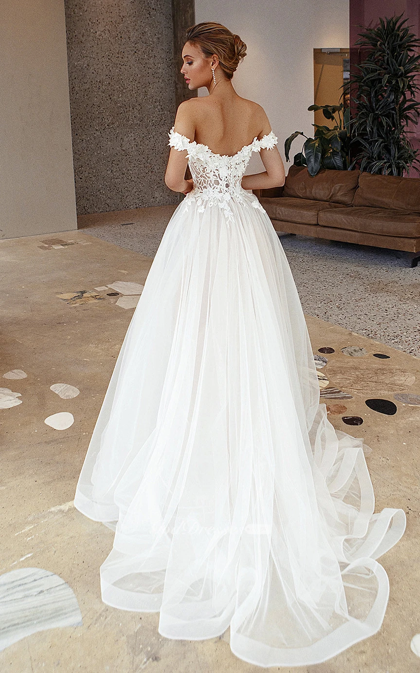 Casual Off-the-shoulder A Line Lace Chapel Train Wedding Dress with Appliques