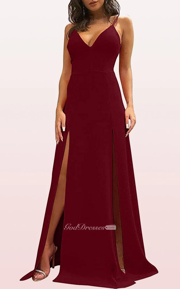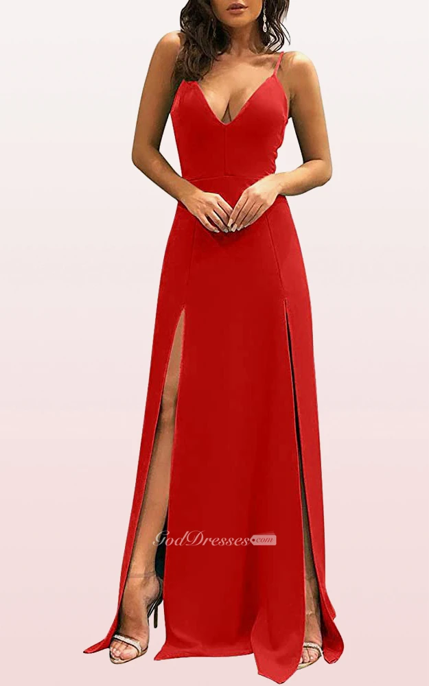 Casual Satin V-neck A Line Sleeveless Prom Dress With Split Front