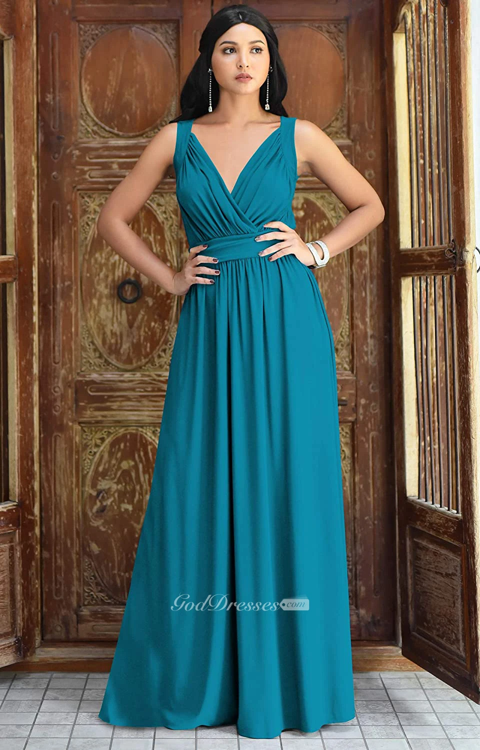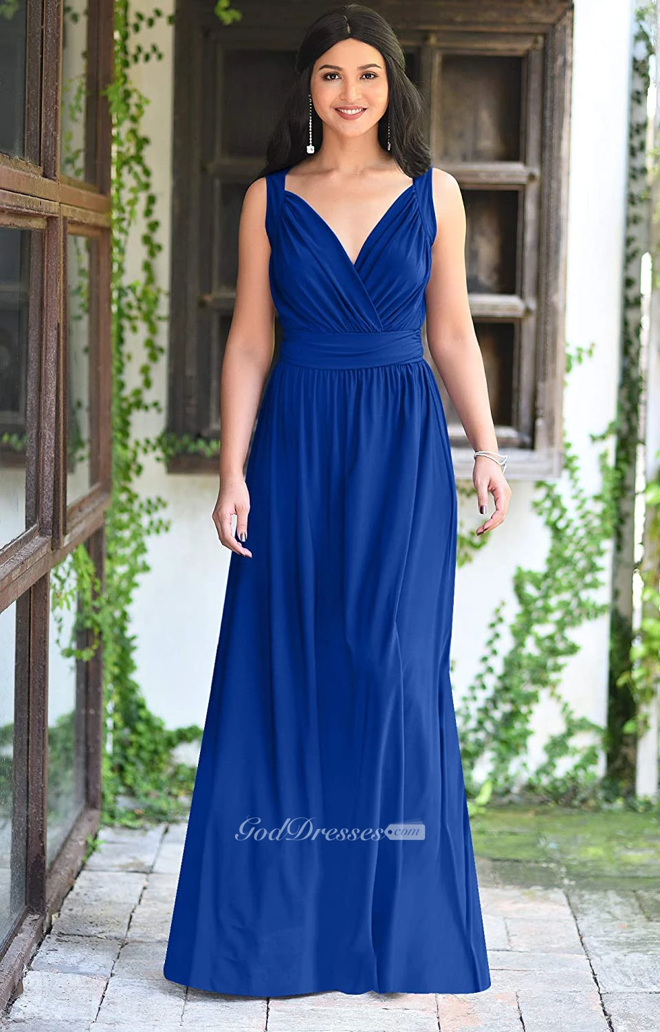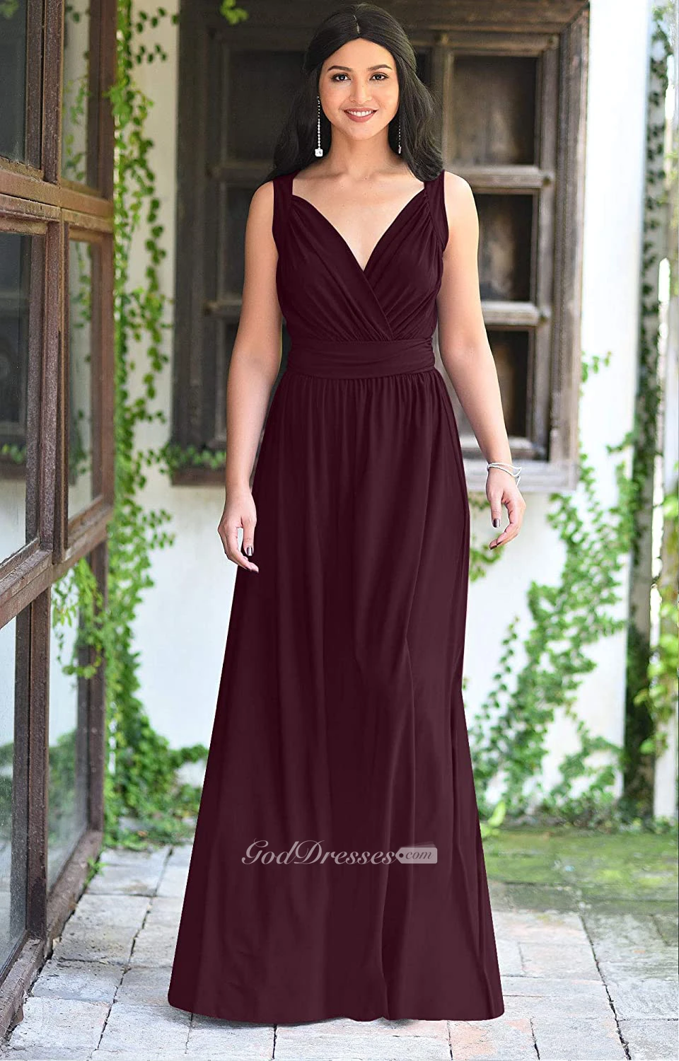 Casual V-neck A Line Sleeveless Floor-length Chiffon Bridesmaid Dress With Ruching