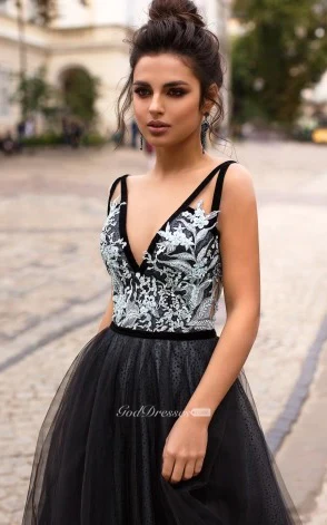 Casual V-neck A Line Tulle Floor-length Sleeveless Prom Dress with Appliques