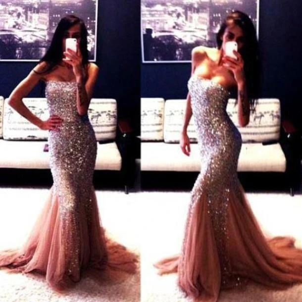 Champagne New Gorgeous Mermaid Strapless Prom Dresses Sleeveless Beadings Evening Gowns With Ruffles
