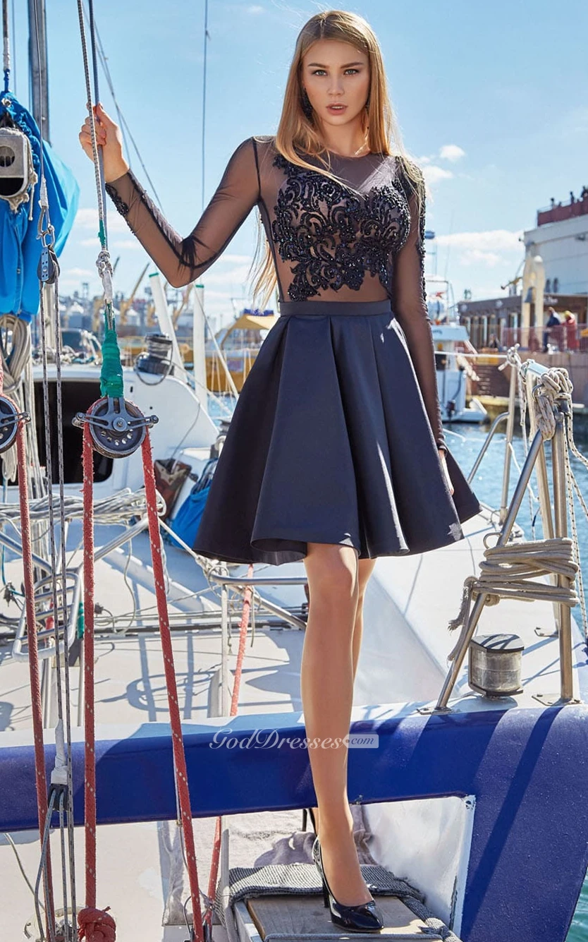 Charming Bateau A Line Lace and Satin Mini Evening Dress with Appliques and Ruffles