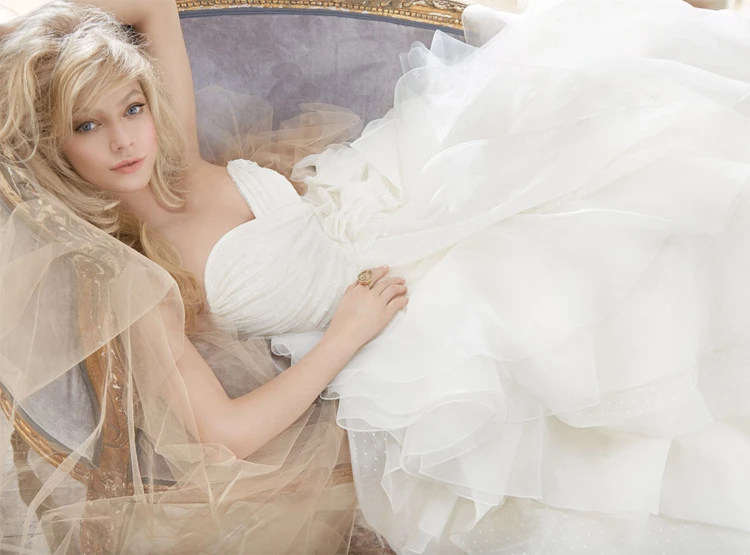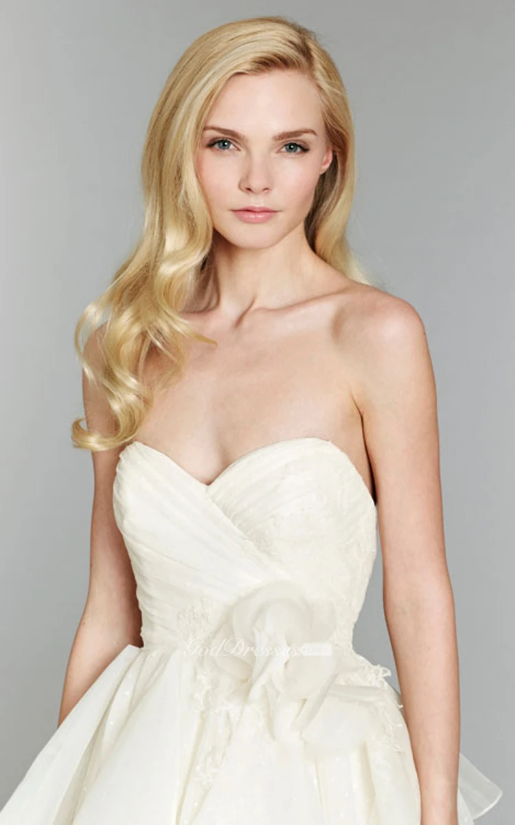 This flamboyant organza gown is a veritable piece of art. Strapless sweetheart neckline bodice is delicately ruched and crisscrossed tightly wrapping your body. Volumetric floral detail adorns the waist. Full A-line skirt with a sweep train behind dramatically flares to the feet in a vapory cascade of ruffled waves.